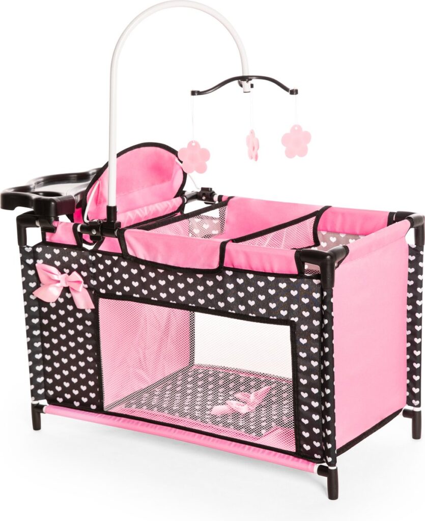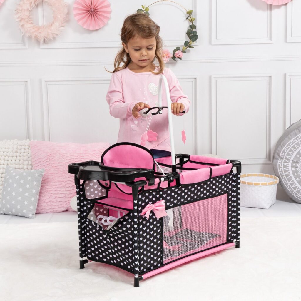 Het multibed biedt talloze speelmogelijkheden. In de geïntegreerde kinderstoel kunnen de poppen comfortabel gevoed worden dankzij het eetblad. Om de accessoires van de poppen op te bergen, bevat het bedje een vak dat gemakkelijk kan worden gesloten en geopend dankzij de klittenbandsluiting. Met de hangers in de set (3 stuks) kunnen de poppenkleertjes worden opgehangen. Bovendien is achter het zitje een verschoningsruimte voorzien om de pop te verschonen. Dankzij de mobiel wordt de pop altijd vermaakt tijdens het verschonen. Het meegeleverde kussen en dekentje zorgen voor een gezellige en knuffelbare slaap voor de pop.
