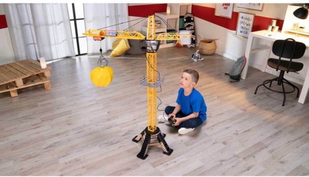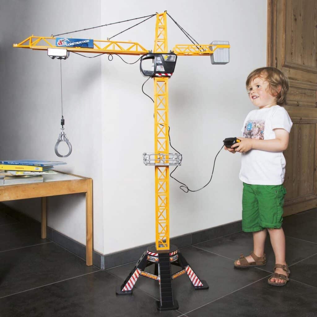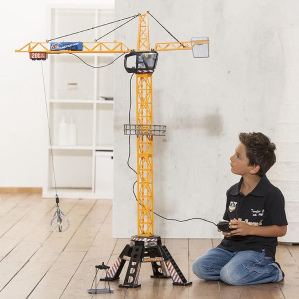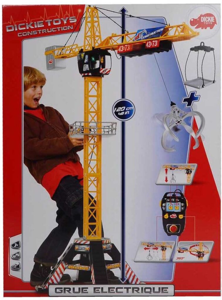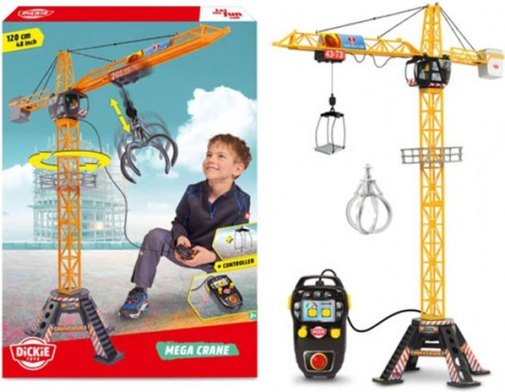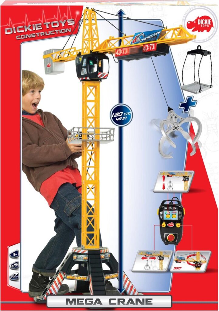 The Dickie construction crane can be controlled remotely: rotate 350°, use the accessories to move equipment (grab arm and shelf) and pick everything up with the hook! The crane is 120 cm high and runs on batteries (not included). For workers aged 3 and up.