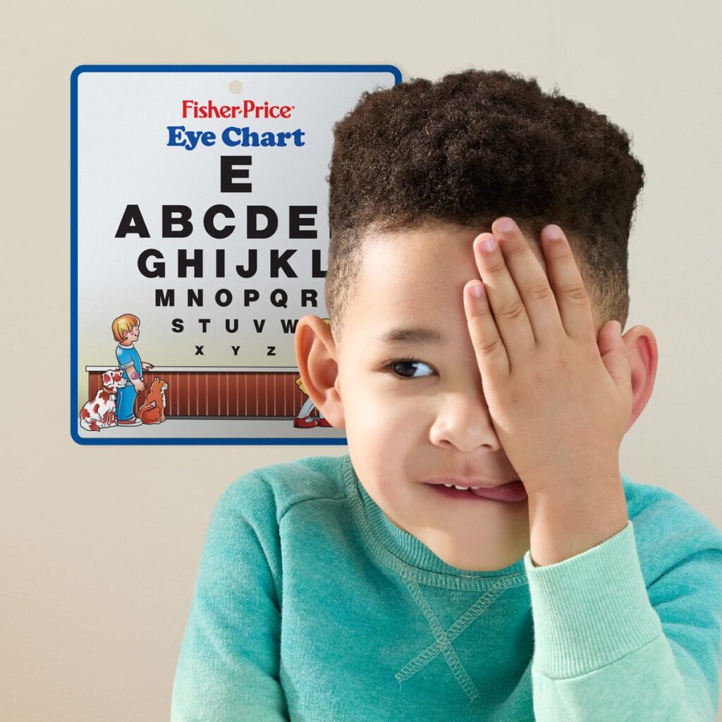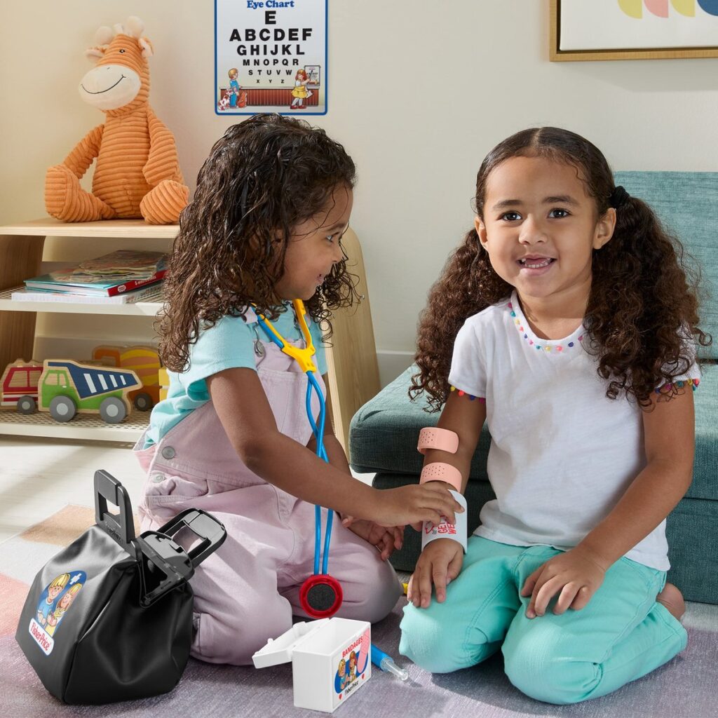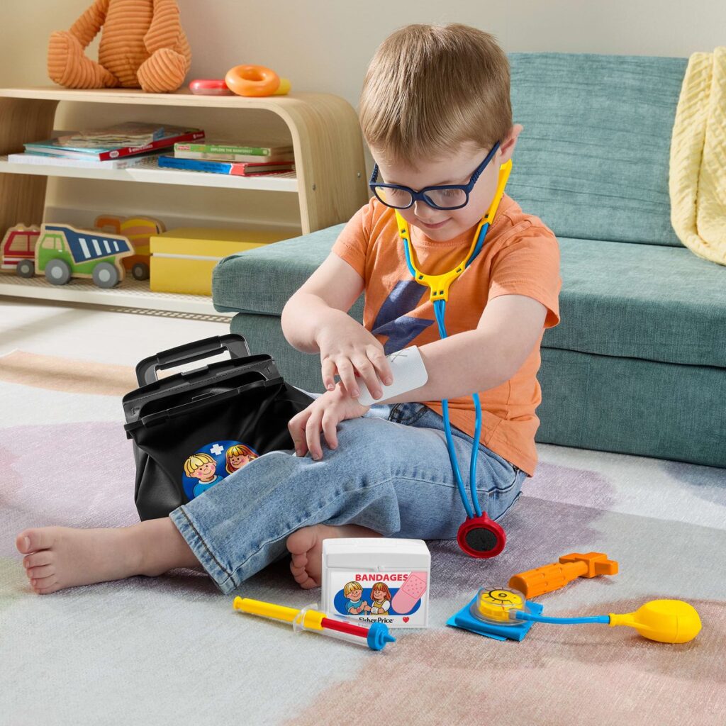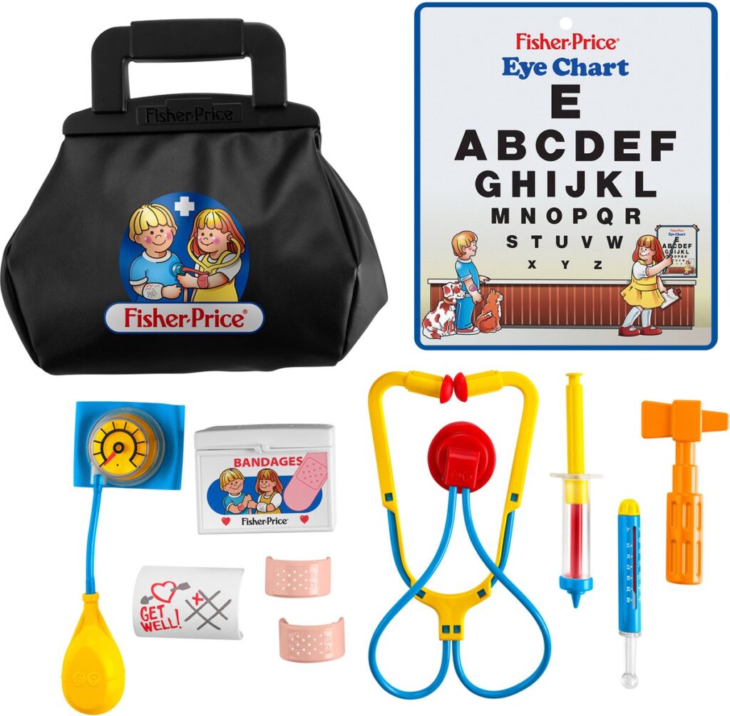 Playing doctor goes back in time with the classic Fisher-Price doctor's kit from 1988! In honor of Mattel's 80th anniversary, this 11-piece fantasy play set looks exactly as you remember it, with the iconic stethoscope, a cuff to measure blood pressure, and even an eye chart! Kids love playing doctor and examining "pretend" patients, taking their temperature with the thermometer, testing reflexes with the hammer, and giving an "injection" with the syringe. All the tools fit in the fabric doctor's bag, so kids can play with them anywhere, even on the go. Colors and decorations may vary.