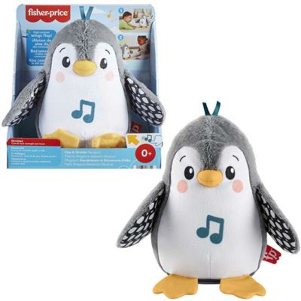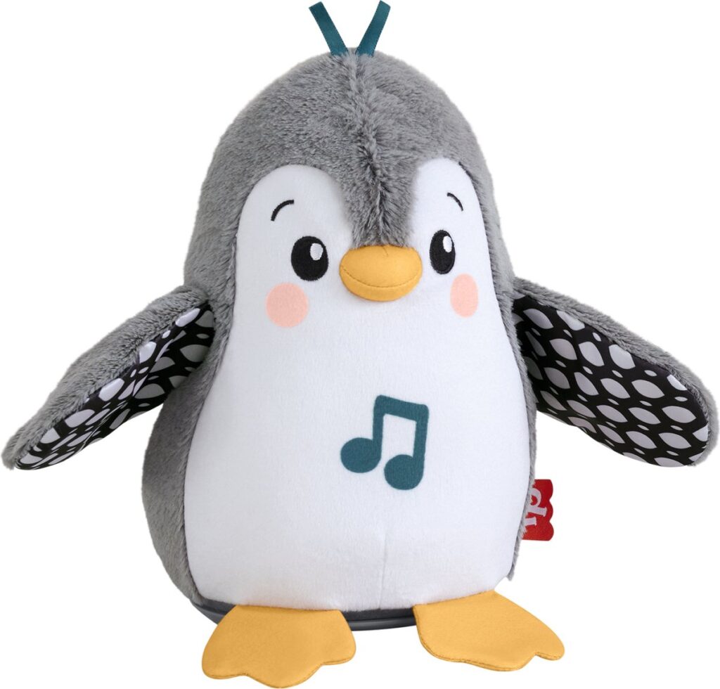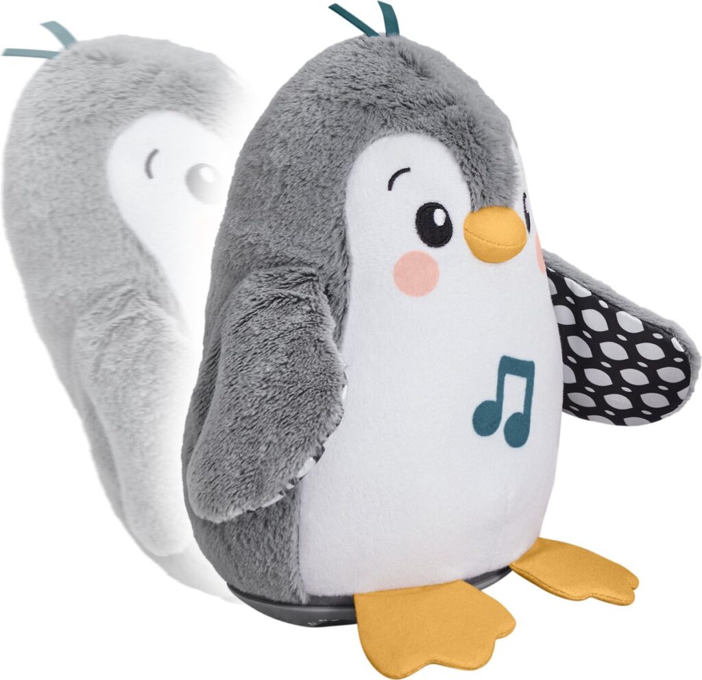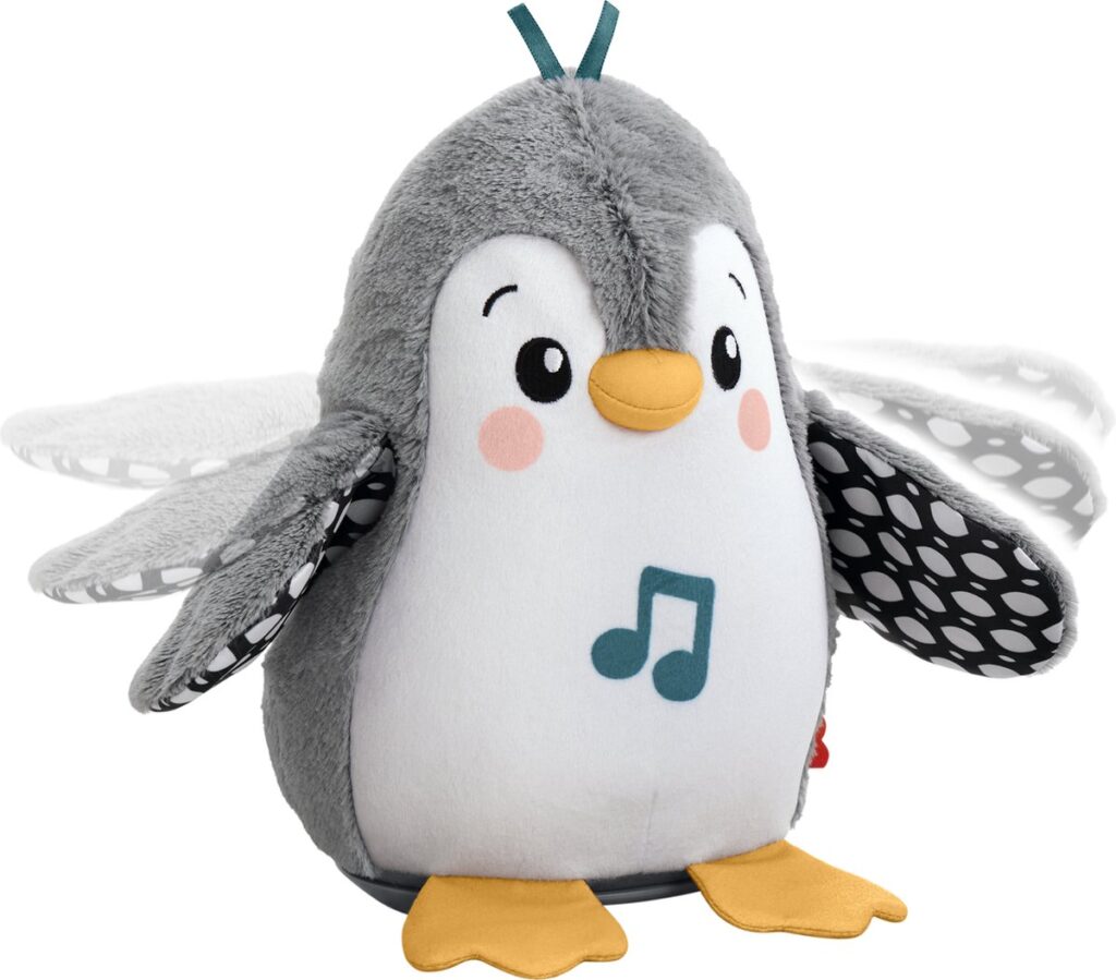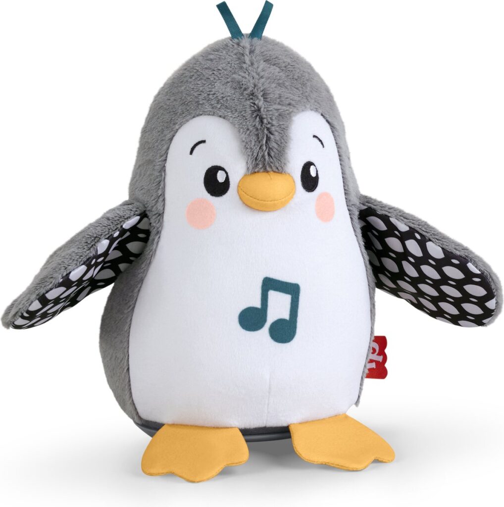 Playing on your tummy becomes even more exciting with the musical Fisher-Price Wapper and Wiggle Pingun cuddly toy. This friendly cuddly toy with a sweet face reacts to the baby's touch with fun fluttering movements and music. For older babies, the wiggly base of the penguin encourages them to sit up and tap their friend for more cheerful tunes and fluttering action. The high contrast of the black and white patterns, the soft fabric, the crackling feet, and the fun music help develop your baby's vision, sense of touch, and listening skills.