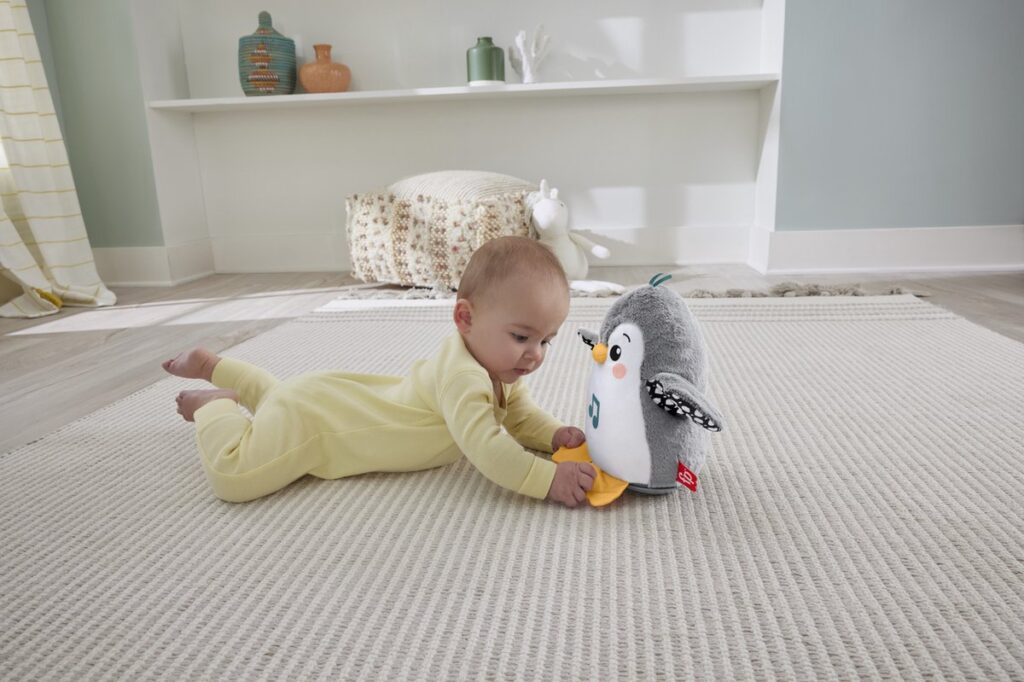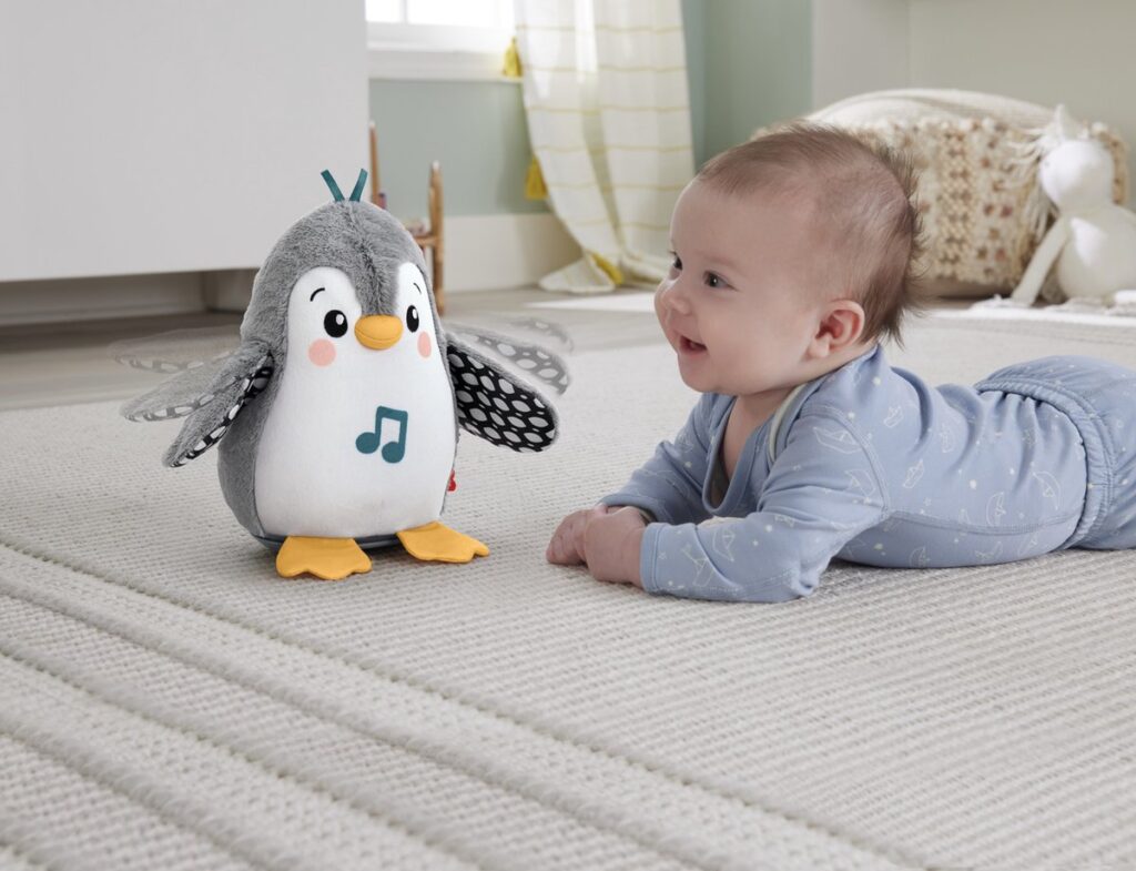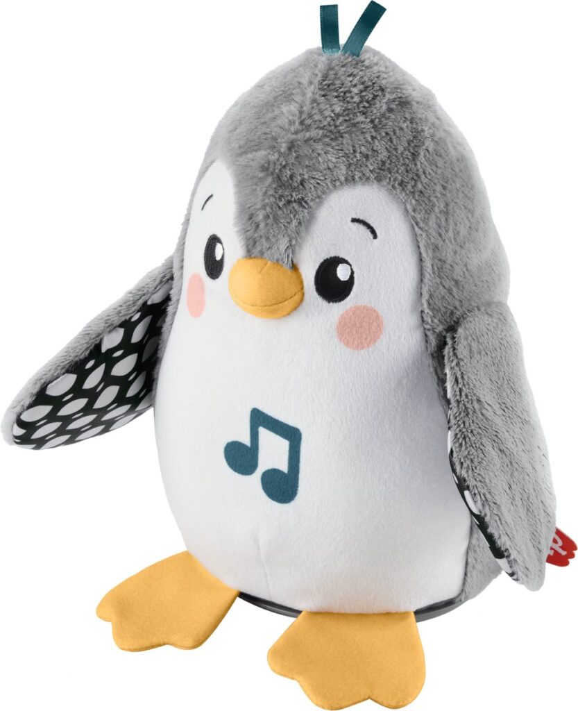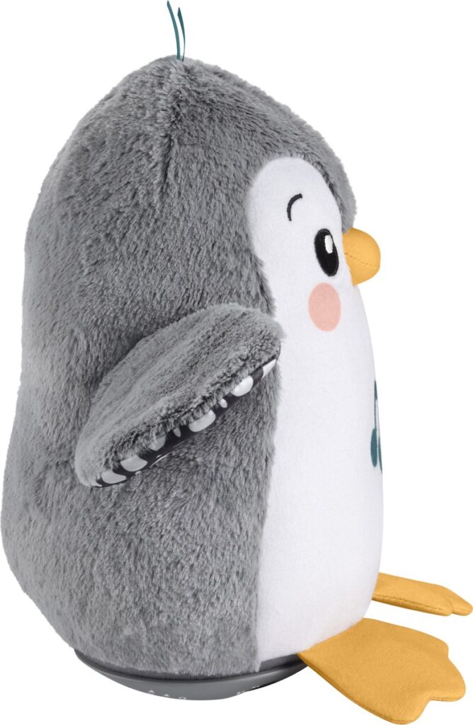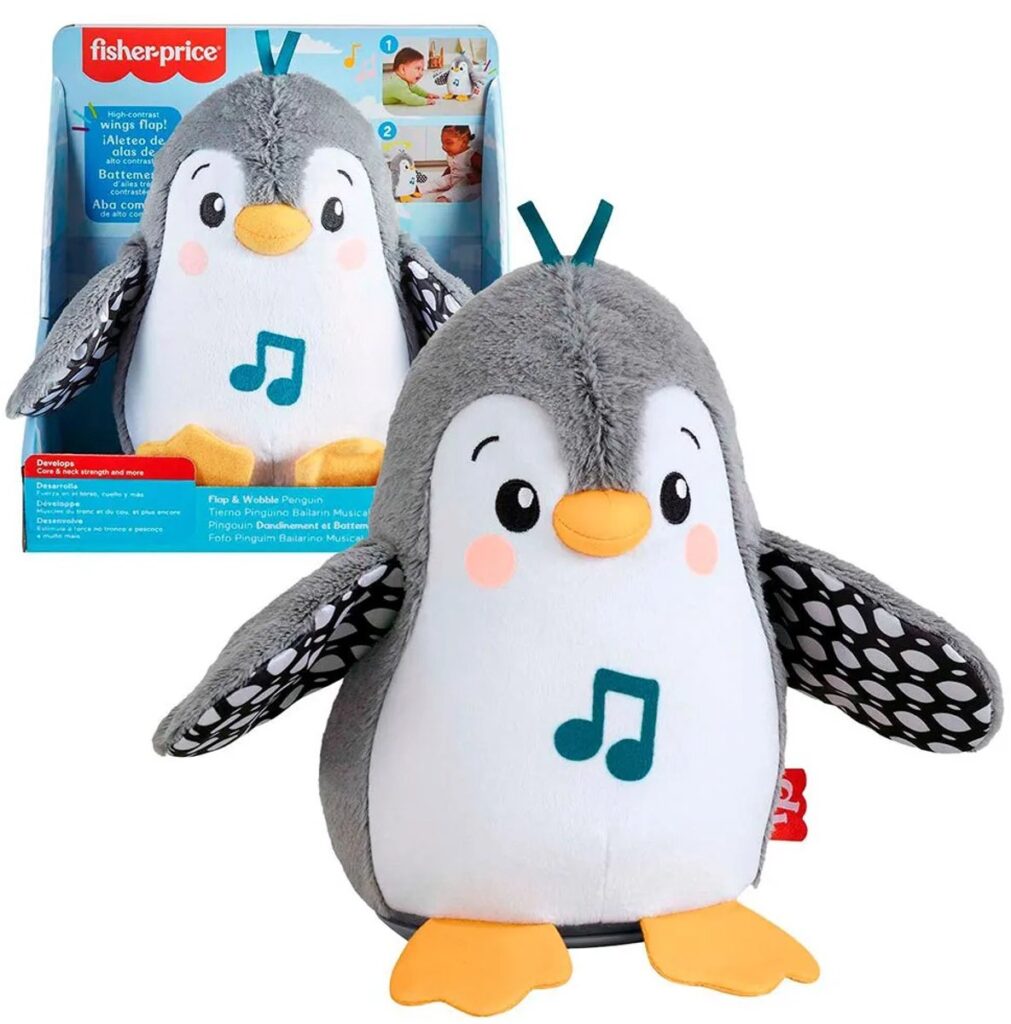 Playing on your tummy becomes even more exciting with the musical Fisher-Price Wapper and Wiggle Pingun cuddly toy. This friendly cuddly toy with a sweet face reacts to the baby's touch with fun fluttering movements and music. For older babies, the wiggly base of the penguin encourages them to sit up and tap their friend for more cheerful tunes and fluttering action. The high contrast of the black and white patterns, the soft fabric, the crackling feet, and the fun music help develop your baby's vision, sense of touch, and listening skills.