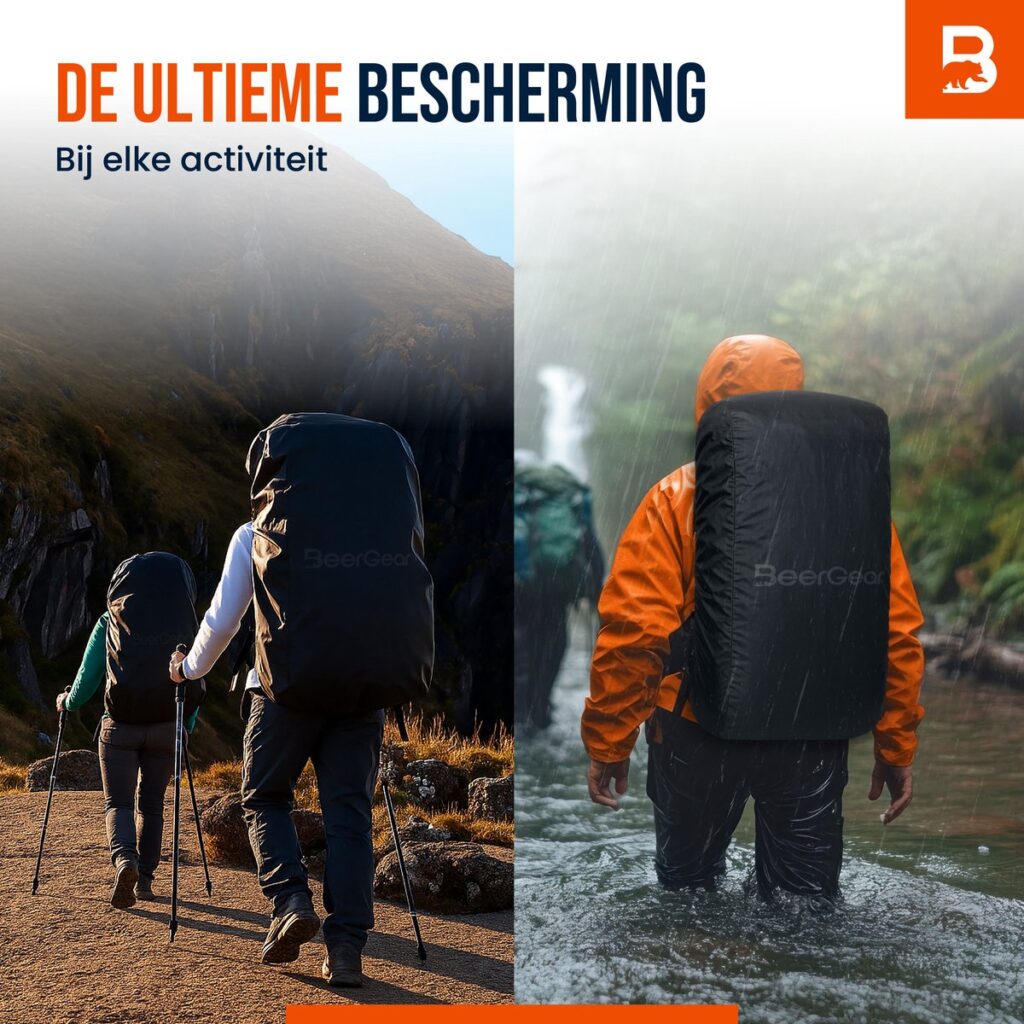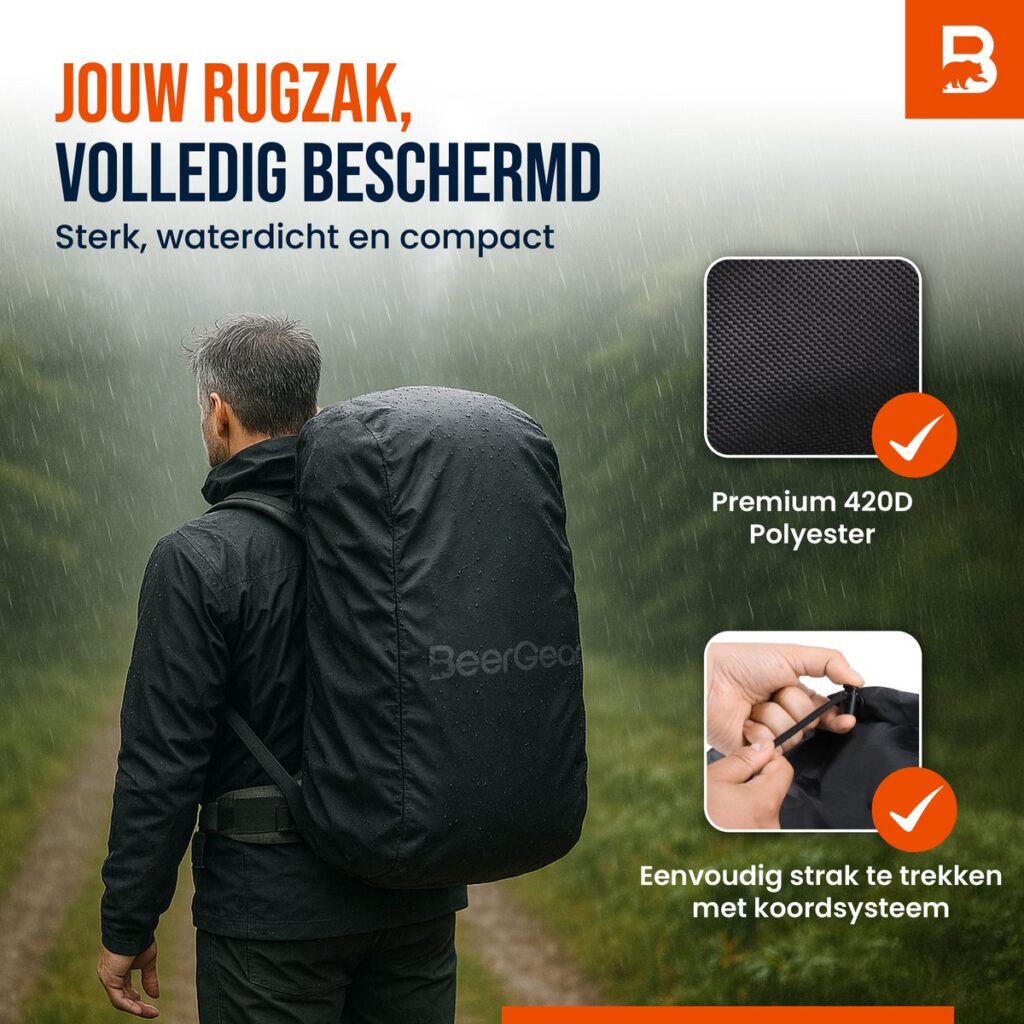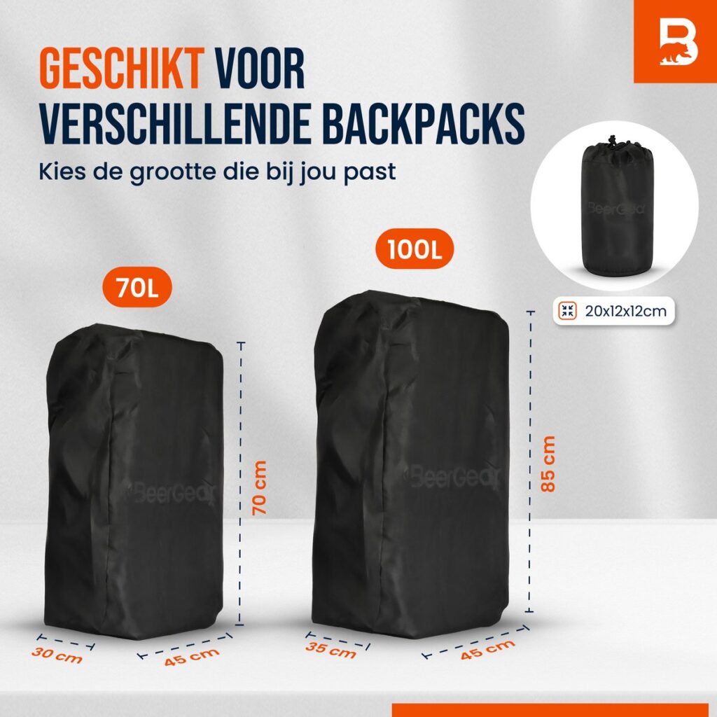 The BeerGear® cover is suitable for backpacks with a capacity of 50 to 70 liters. Thanks to the handy cord system, you can easily pull the cover tight around your bag so that it fits perfectly and does not flap in the wind. This ensures a secure, stable fit and prevents water or dirt from getting in. Ideal for both short walks and long backpacking trips.