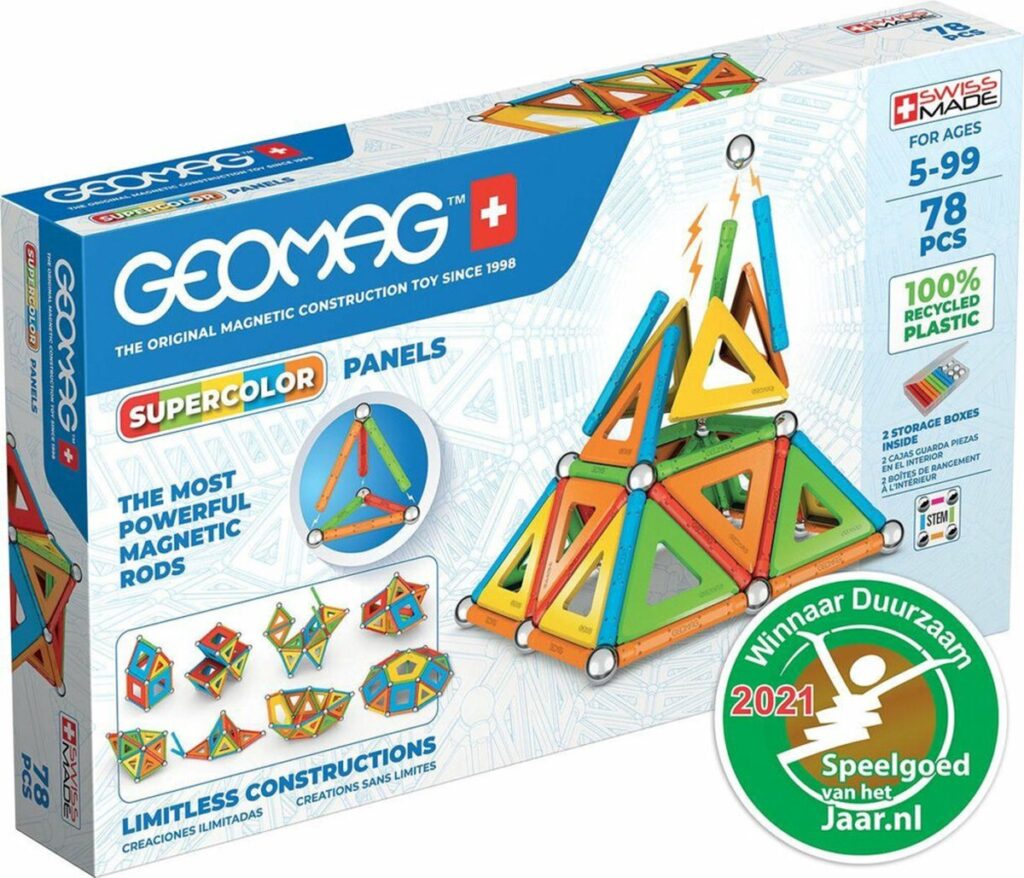Bring your child's imagination to life with the Geomag Super Color Recycled 78-piece set. This enchanting construction set, full of sparkling colors and magnetic magic, lets children build towers that reach for the sky, create cheerful animals, and build their own wonderful worlds. With 28 rods, 20 spheres, 16 triangular panels, 12 square panels, and 2 pentagonal panels, the possibilities are endless. Made from recycled plastic, you're not only choosing endless fun but also a better planet.