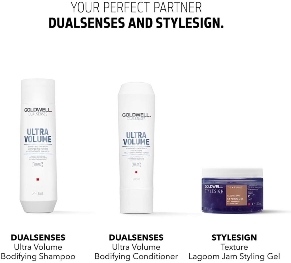 Goldwell Stylesign Ultra Volume Lagoom Jam is een hydro gel die de hele dag door het haar in gewenst model houdt, met extra volume en een grenzeloze finish. De gel is ideaal te gebruiken voor het föhnen, maar is ook zeer geschikt voor directe styling. De Goldwell Lagoom Jam is een alcohol vrije gel – verrijkt met bamboe extracten, proteïnen. De gel beschermt het haar tegen hitte en kleurvervaging. Deze gel verzwaard het haar niet en is daarmee geschikt voor ieder haartype.