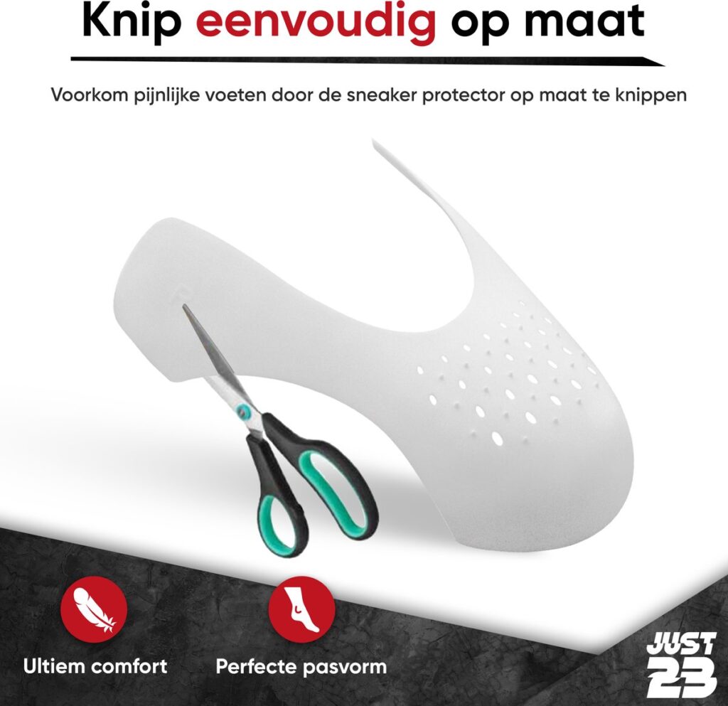 Are you tired of your new shoes being full of ugly folds and creases? Then the crease protector of JUST23 is the solution to your problem! The sneaker protector ensures that all shoes keep their beautiful shape after months of walking. Your shoes remain not only longer beautiful but also last longer, so you have less money to spend on shoes. shoes. Benefits The crease protectors of JUST23 will help every sneaker fan keep their sneakers beautiful. keep Keeps your shoes free of creases - Prevents shoes from becoming full of creases and creases after several weeks. Fits all shoes - Thanks to the flexible material, sneaker protectors from JUST23 will fit in all shoes. Stays extra well - At the top of the crease protector are protruding dots that press into the top of the shoe making him well stays in place. Cuttable - Is it not quite right? Or is it a little too big? You can easily and quickly cut it to size. Durable - Because your shoes are less likely to break you save a lot of money buying shoes! Avoid the famous crease Yes, we all recognize it. We have beautiful new Jordans and after a few few weeks they already show up, the ugly crease on the front of your shoe. This problem is inevitable, or is it? No! Because thanks to the protector of JUST23 the well-known crease is a thing of the past. The protector ensures that that the shoe does not deform while walking resulting in a shoe that always looks like you just came from the store. Save money The protector of JUST23 ensures not only that your shoes stay more beautiful because it also ensures that your shoes will wear out less quickly. During During walking, there is a lot of movement in your shoes, which causes your shoes will wear out quickly. The protector ensures that there is less movement in your shoes so you can do longer with your shoes. Also nice for your wallet! Can I feel the protector? The protector is made of flexible and cuttable material which ensures that You can cut and shape it to your own foot. Because of this you You will not feel it after a few days! Thanks to the protruding at the top of the protector, it will not move while walking and other movements. How does the protector work? It is actually very simple, you remove the soles of your shoes, put the protector and put the soles back in. Doesn't it feel nice? Then You can quickly and easily cut the protector until it feels fine. feels fine. Does it work with all shoes? Yes, the protector will fit any shoe and keep it wrinkle-free. 100% Satisfaction Guarantee We stand behind the quality of our product and therefore will also offer a 100% satisfaction guarantee! Do you have any questions or comments? Please send us directly and we will try to help you as soon as possible. Order now and protect your shoes from ugly wrinkles and creases tomorrow!