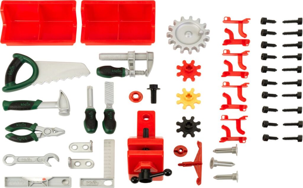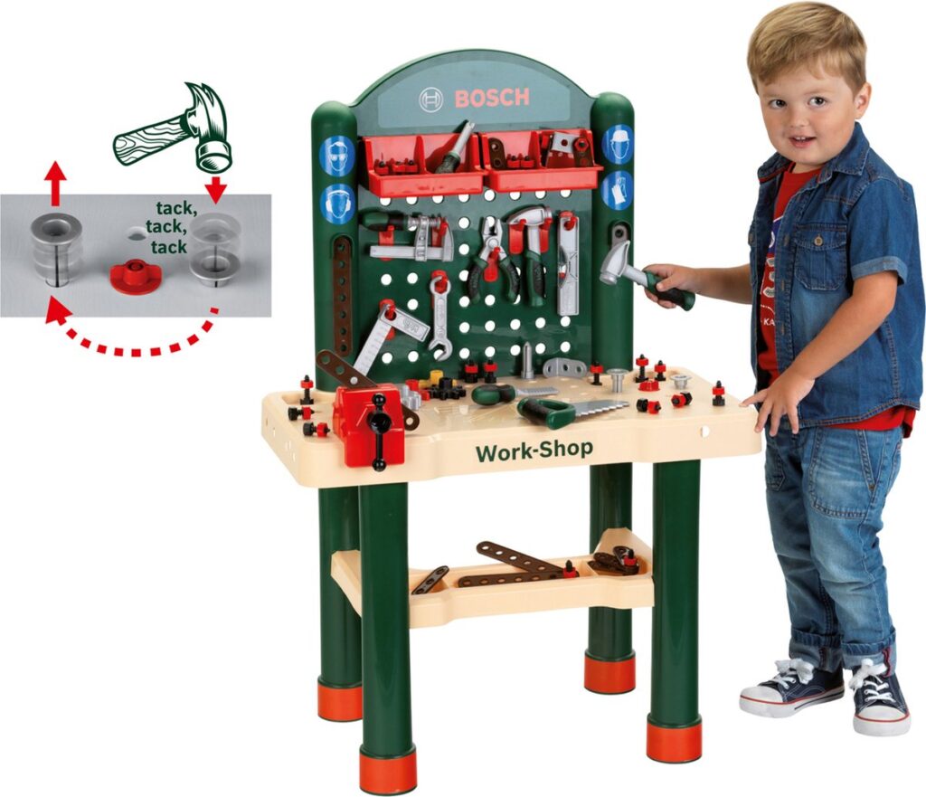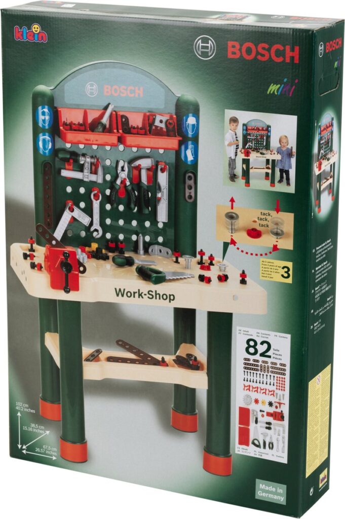 De droom van kleine doe-het-zelvers, volledig vervuld – de Bosch werkbank met schroevendraaier, steeksleutel, tang, vijl, hamer, zaag, weegschaal, winkelhaak en lijmklem, bankschroef, twee opbergboxen, ophanghaken, spijkers, schroeven, moeren, evenals korte en lange latjes. Het werkblad in houtlook ziet er niet alleen aantrekkelijk uit, maar heeft ook een belangrijke functie: Klein Toys heeft een spijkerspel ingebouwd waarmee kinderen kunnen leren hoe ze met een speelgoedhamer spijkers kunnen inslaan. Alles in de Bosch Work-Shop is gemaakt van hoogwaardig kunststof, heeft afgeronde randen en is tot in detail zo ontworpen dat het kindvriendelijk en veilig is. De werkbank in het hoogwaardige Bosch-design is bovendien Made in Germany, wat staat voor goede afwerking en duurzaamheid.