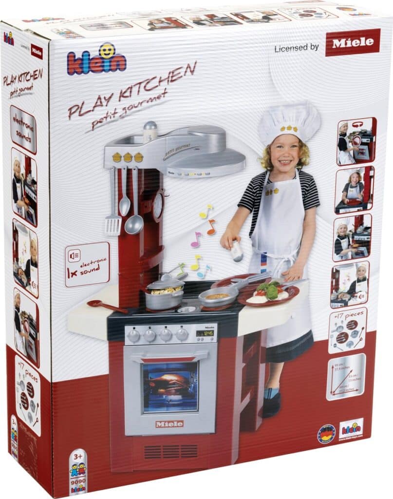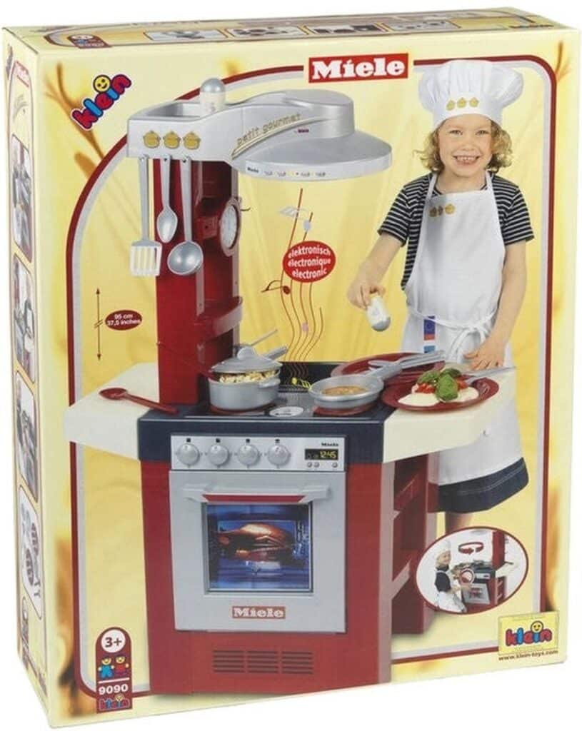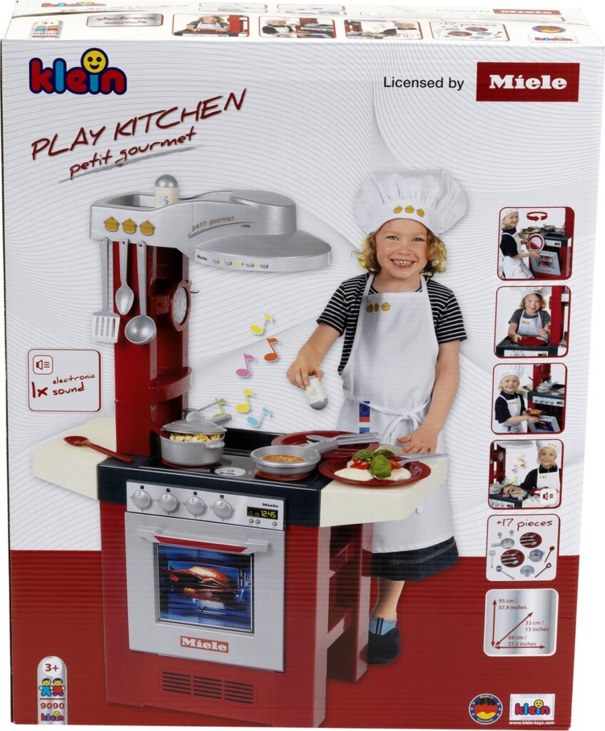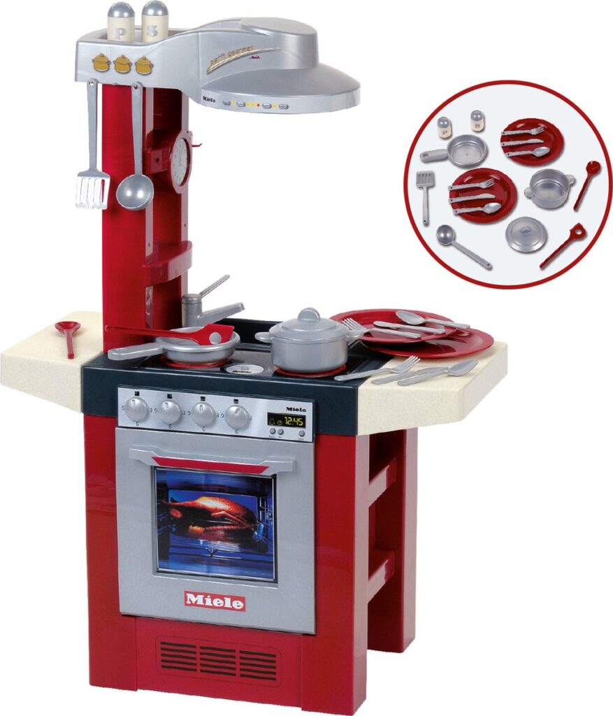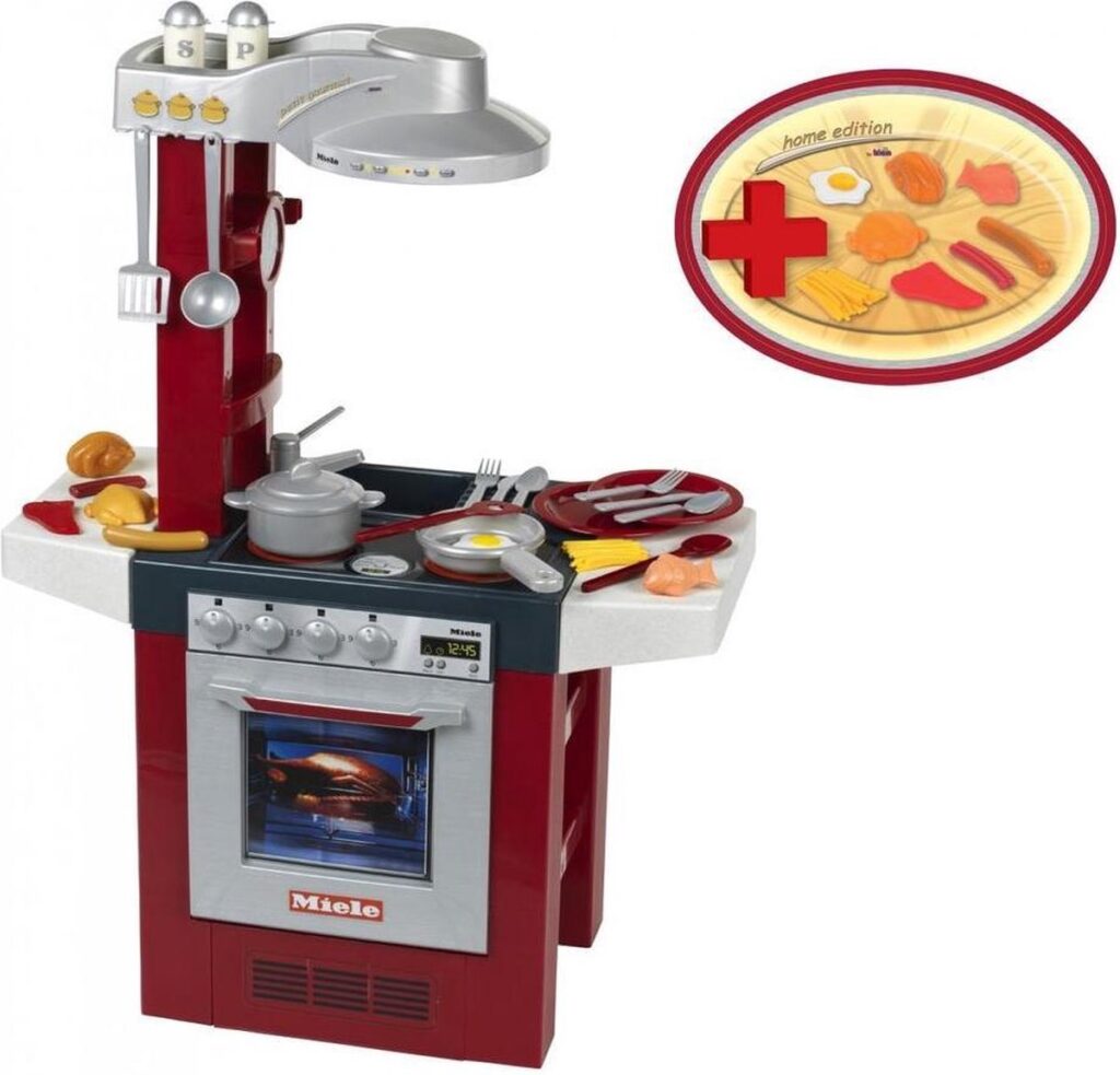 The children's play kitchen in Miele design, which can be used from both sides, surprises little cooks in the nursery with a hob with a sound module that electronically simulates cooking sounds. It is equipped with numerous play options and lots of accessories: an oven, a dishwasher, an extractor hood, a sink and handy storage compartments. She also includes a pan, a pot with lid, cooking utensils (a spatula, a ladle and two wooden spoons) and a dining set for two, with two plates, forks, knives and spoons and a salt and pepper shaker.