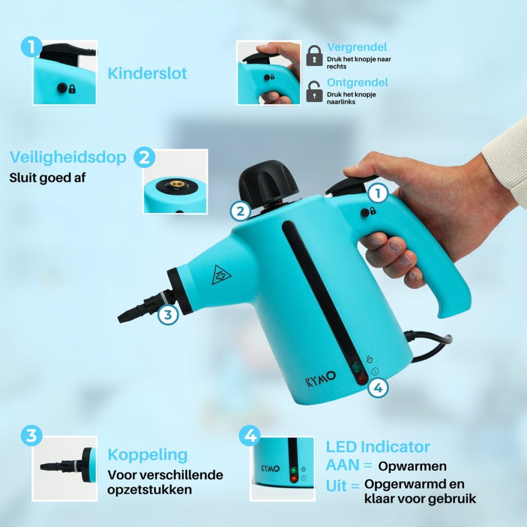 De Kymo stoomreiniger is niet alleen krachtig, maar ook veilig en gebruiksvriendelijk. Met zijn kind veilige vergrendeling en compacte ontwerp kun je zorgeloos schoonmaken. Bovendien kan het apparaat meer dan 10 minuten continu stomen, ideaal voor langere reinigingssessies.