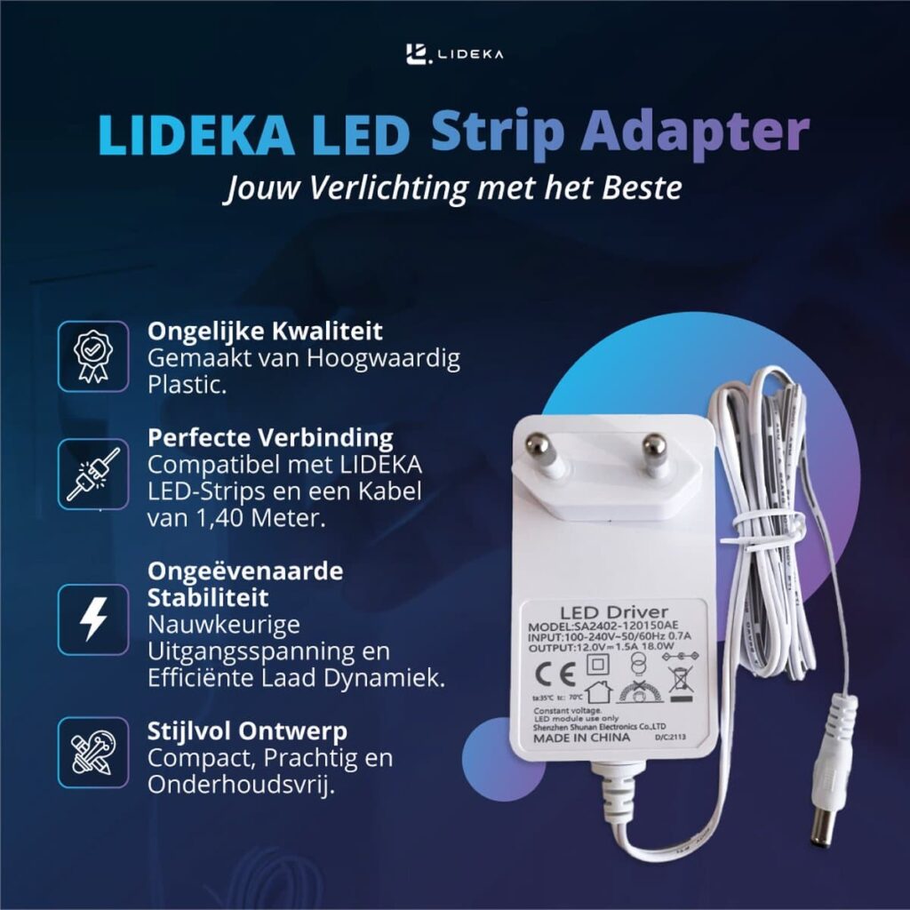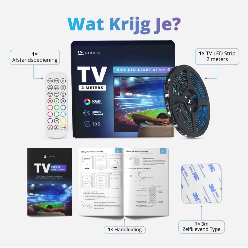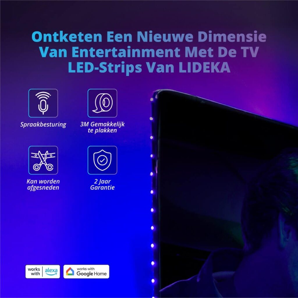 "Light up your home in a smart and stylish way with the Lideka - LED Strip 3 Meter. This RGB LED strip is the latest on the market and has many features that allow you to illuminate your home in a unique way. The LED strip is self-adhesive, so you can install it easily and quickly. You can cut it to the desired length and adjust the color and brightness with the included remote control or the extensive app. With compatibility with Google and Alexa, you can also control the lighting with your voice. Highest brightness The Lideka - LED Strip 3 Meter offers the highest brightness and is made of the best and most durable SMD 5050 LEDs. This ensures very bright and vibrant lighting that illuminates the entire room. Easy and quick installation The LED strip is equipped with self-adhesive tape that allows for easy and quick installation. The strongest 3M tape ensures that the LED strip stays firmly in place. Music option With the music option of the Lideka - LED Strip 3 Meter, you can make the lighting flash to the beat of your favorite music. This creates a unique and cozy atmosphere in your home. Extensive app With the extensive app, you can personalize the lighting even further. You can choose from 16 million colors and adjust the brightness and color to your liking. The app also offers many other functions that allow you to control the lighting. Latest remote control The LED strip comes with the latest remote control that allows you to easily control the lighting. You can adjust the color and brightness and turn the lighting on and off. 2 year full warranty You get a 2 year full warranty on the Lideka - LED Strip 3 Meter. This gives you the certainty that you are getting a product of the highest quality. Crystal clear The LED strip is crystal clear and provides very bright and vibrant lighting that illuminates the entire room. Google and Alexa compatible The Lideka - LED Strip 3 Meter is compatible with Google and Alexa. This means that you can control the lighting with your voice, making it even easier and more convenient to adjust the lighting. Benefits: Create a unique and cozy atmosphere in your home with the Lideka - LED Strip 3 Meter. The LED strip offers the highest brightness and is made of the best and most durable SMD 5050 LEDs. With the music option and the extensive app, you can personalize the lighting even further. The LED strip is easy to install and stays firmly in place thanks to the strongest 3M tape. With the latest remote control, you can easily adjust the lighting. The Lideka - LED Strip 3 Meter is compatible with Google and Alexa, allowing you to control the lighting with your voice. You get a 2 year full warranty on the Lideka - LED Strip 3 Meter. What's in the package? 1× RGB LED Strip 1× Remote control 1× White box 1× Plug 1× Manual 1× 3M tape for the white box Important product information Number of LEDs: 90 Power: 18W IP value: IP65 Lifespan: approx. 50,000 hours Number of lumens Lumen Material: plastic, copper, silicone, plastic Delivery: comes in a complete package RGB: most color combinations Conclusion The Lideka - LED Strip 3 Meter is the perfect choice if you want to illuminate your home in a smart and stylish way. The LED strip offers the highest brightness and is made of the best and most durable SMD 5050 LEDs. With the music option, extensive app and the latest remote control, you can easily personalize the lighting. The LED strip is easy to install and stays firmly in place thanks to the strongest 3M tape. You also get a 2 year full warranty on the LED strip. Order the Lideka - LED Strip 3 Meter today and create a unique and cozy atmosphere in your home! "