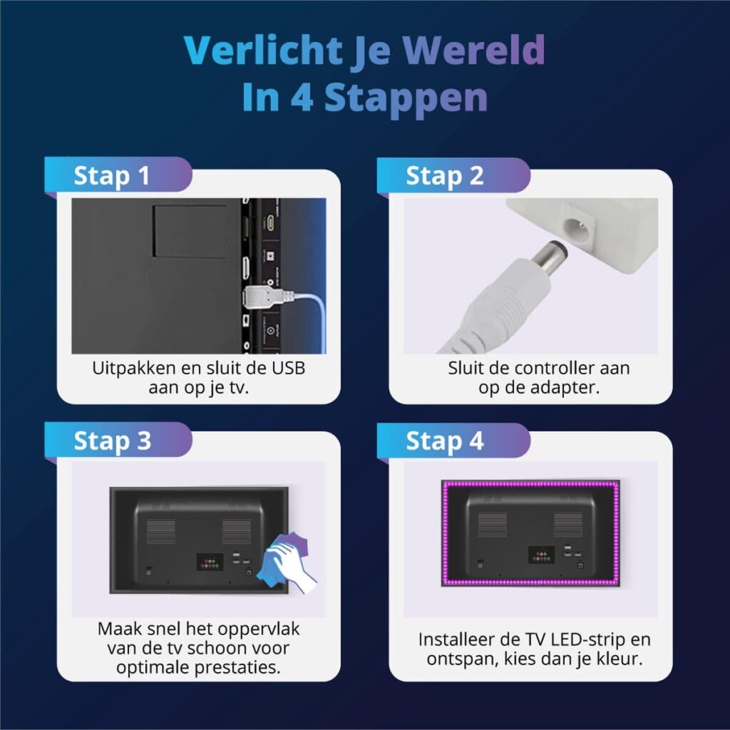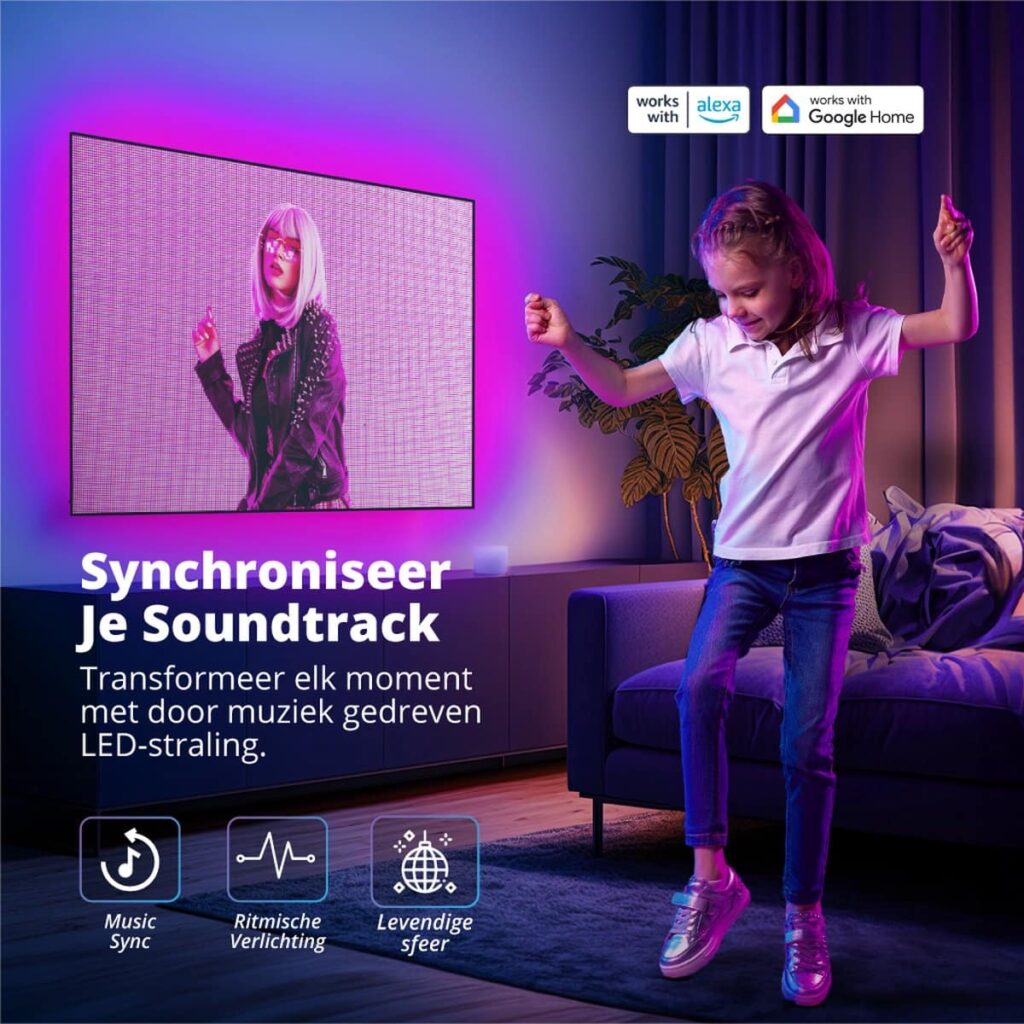 With our special TV LED strip, you can easily create a unique atmosphere and make your viewing experience even more vivid. With the easy control via remote control and app, you can adjust the color and brightness to your liking. Don't hesitate any longer and get this high-quality LED strip today!