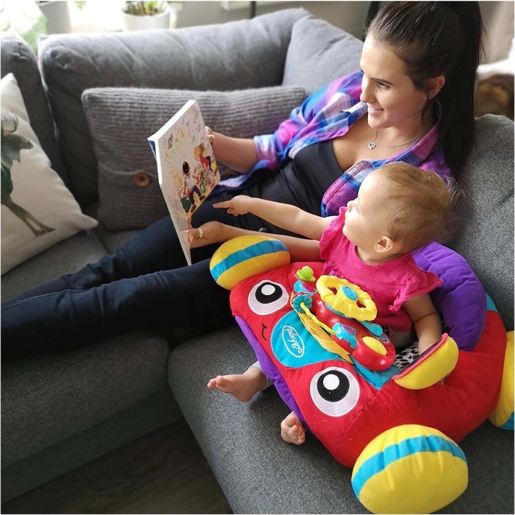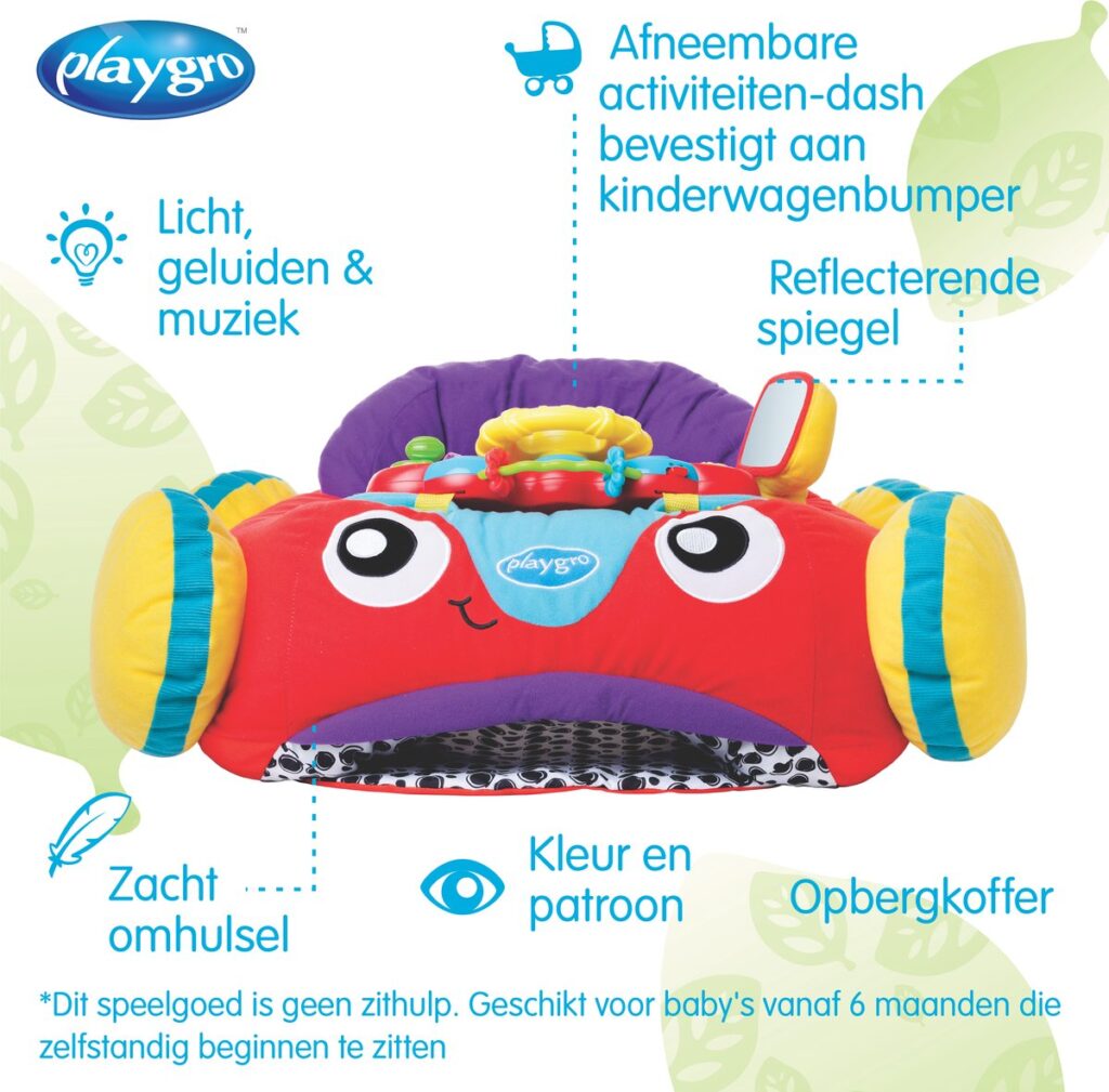 DRIVE. PRESS. HONK. REPEAT! Put your little one in the coolest plush car with the Playgro Comfy Car – a soft seat cushion + activity center + mini baby gym in one bright red race car! From the driver's seat, baby activates lights, sounds, rattles, crinkles, and a real horn – just by grabbing, kicking, or leaning.