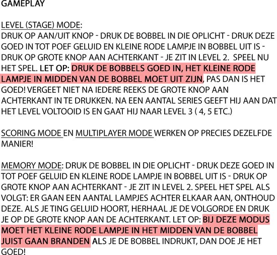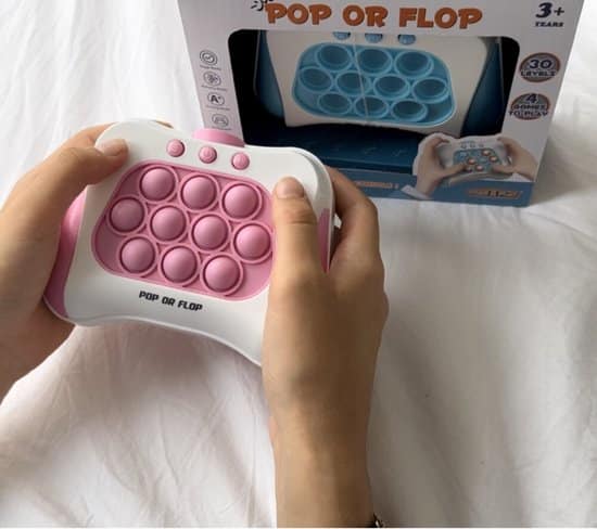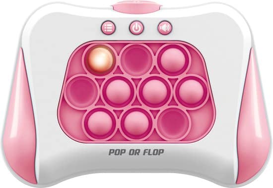 Improve your reflexes with this pink, portable Pop or Flop Game Console with 4 different electronic pop-it games with 30 levels. The 10 bumps on the game console always light up in a certain pattern. The goal is to press the bobble that lights up as fast as possible. Then press the bumps on the back back back up, after which the next combination will appear on the console.