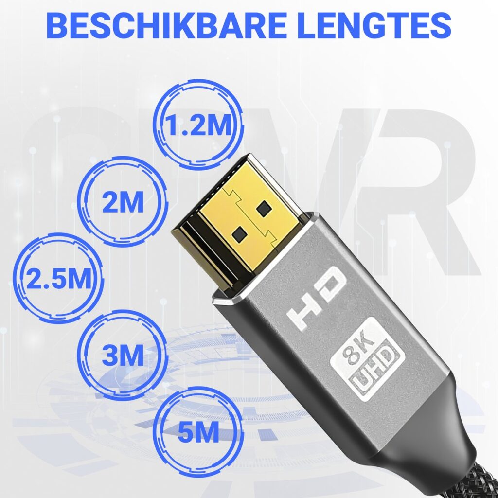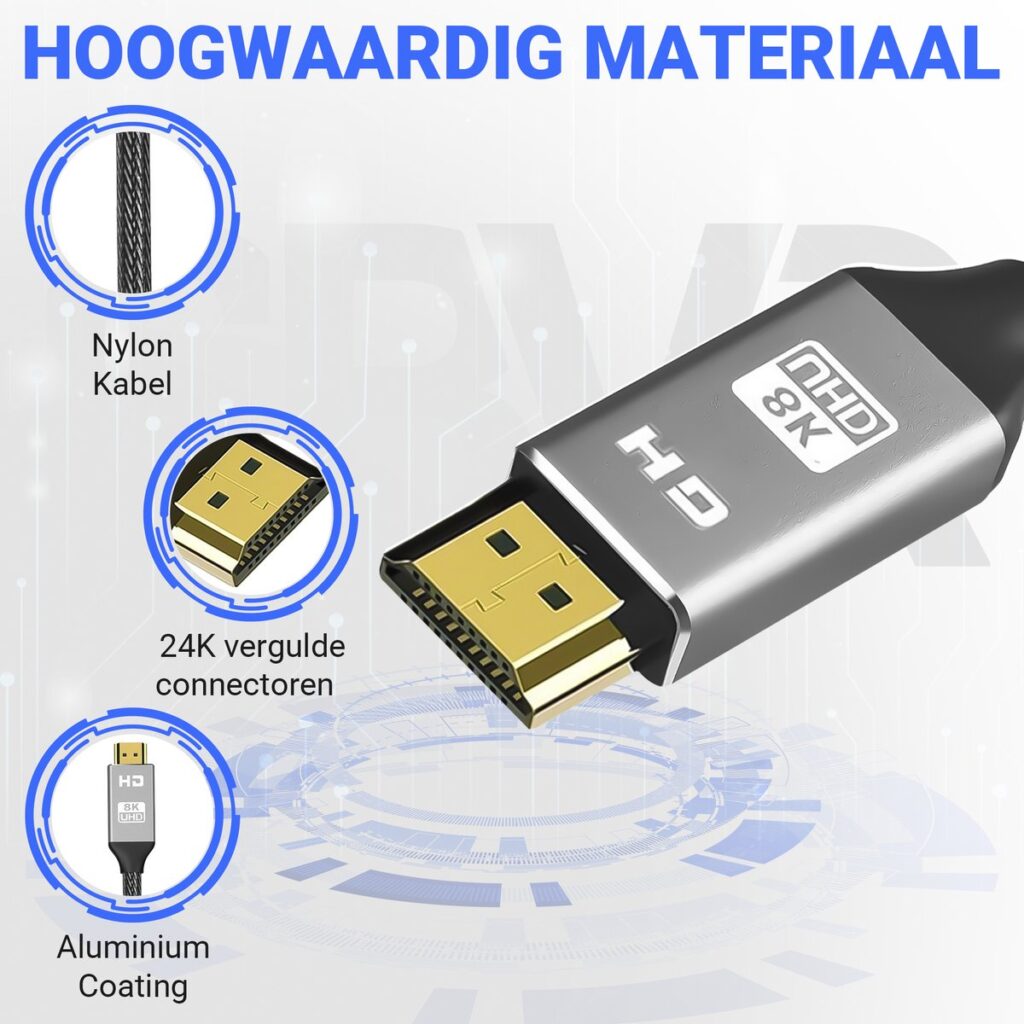 Experience Unmatched Image and Sound Quality with the SBVR DisplayPort 2.1 Cable. Step into the world of 16K resolution and superior refresh rates with the SBVR DisplayPort 2.1 cable. Designed for the most demanding users, this cable offers unmatched video and audio performance. The cable supports resolutions up to 16K at 60Hz, 8K at 120Hz, and 4K at 240Hz for breathtaking image quality and smooth playback, ideal for gaming, 3D rendering, and video streaming. SPECIFICATIONS: * Resolutions up to 16K at 60Hz / 4K at 240Hz * Dynamic HDR and Variable Refresh Rate (VRR) * Display Stream Compression 1.4a (DSC) * 24K gold-plated connectors for reliable signal transfer * Durable nylon jacket * HDCP 2.3 security * Maximum bandwidth of 80 Gbps * Cable length: 2 meters (other lengths available) REVOLUTIONARY BANDWIDTH With 80 Gbps bandwidth, the cable transfers large amounts of data quickly and efficiently, ideal for intensive applications such as 8K streaming, gaming, and video editing. Whether you're a gamer or a professional, this cable always delivers reliable performance. ROBUST NYLON CABLE The durable nylon sheath provides protection against wear and damage, while the cable remains flexible for use in tight spaces. HDCP 2.3 SECURITY AND VRR HDCP 2.3 protects your digital content from unauthorized copying. Thanks to VRR, the refresh rate is automatically adjusted for smooth and responsive gameplay. Order the SBVR DisplayPort 2.1 cable now and experience the ultimate connection!