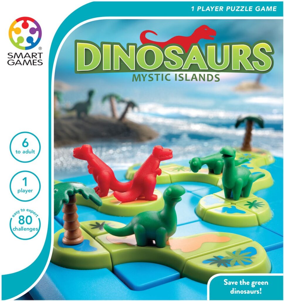 Place the islands and save the green dinosaurs! Can you separate the green plant-eating dinosaurs from the red carnivores in this exciting puzzle game from Smart Games? Discover 80 challenges in which you have to recreate the islands, but make sure that the red and green dinosaurs are not on the same island! Age 6+