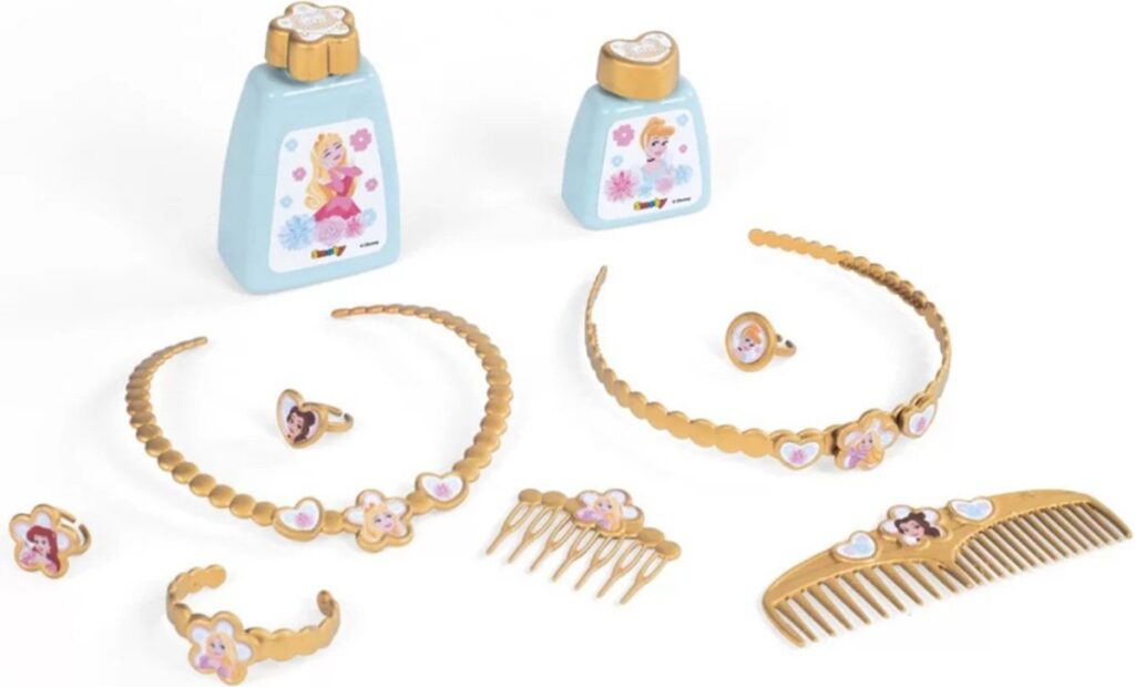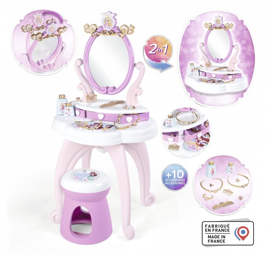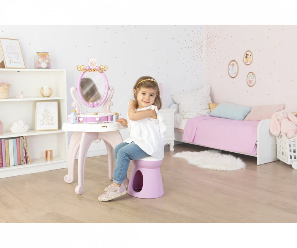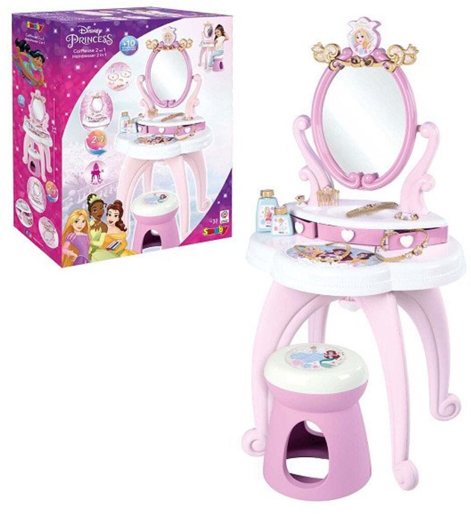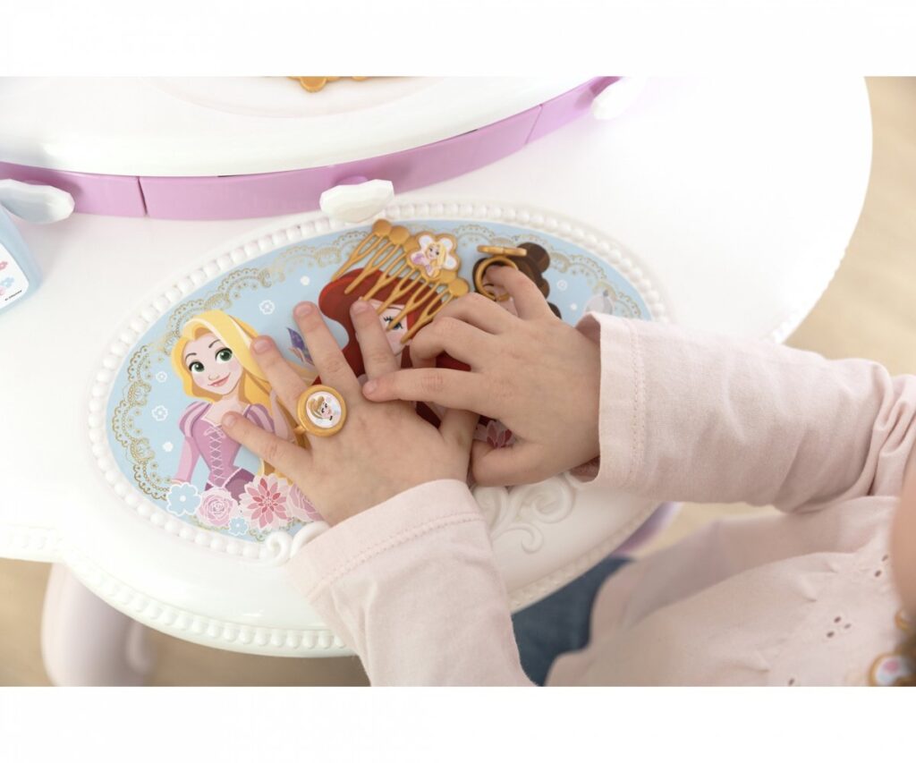 De 2-in-1 Disney Princess kaptafel van Smoby zal elke kleine prinses blij maken! Dankzij het roze kleurenschema past het product prachtig in de inrichting van een meisjeskamer. De tafel met kruk is voorzien van een draaibare spiegel en lades die open kunnen. Het bovenste deel van de kaptafel kan worden verwijderd en op een ander plat oppervlak worden geplaatst, zodat u het product kunt aanpassen aan uw behoeften. De Smoby-set bevat tien accessoires die voldoen aan de verwachtingen van de meest veeleisende meisjes.