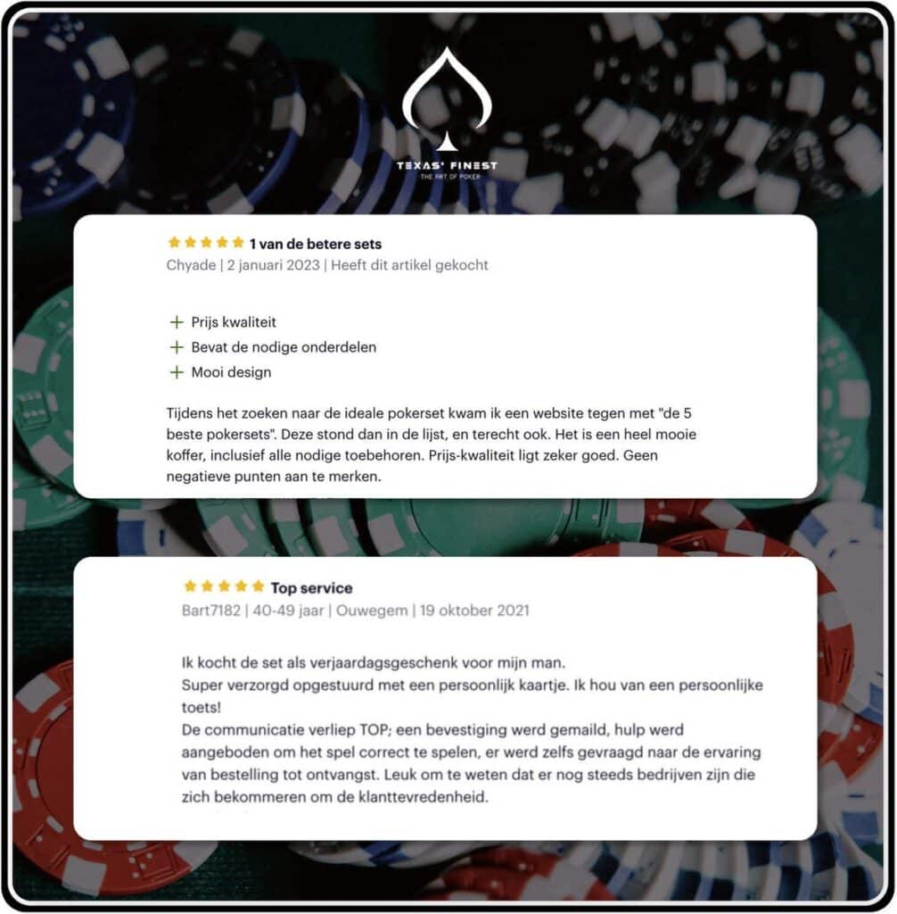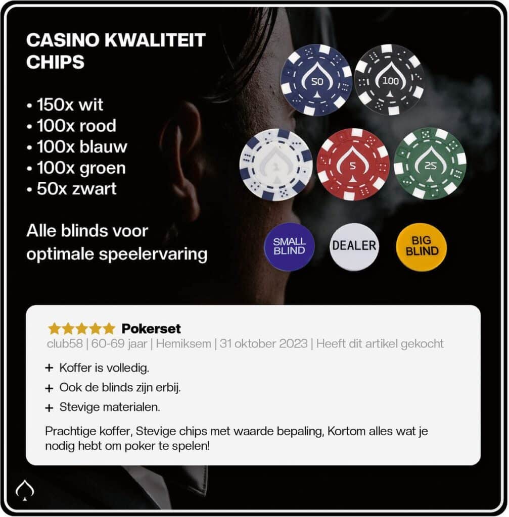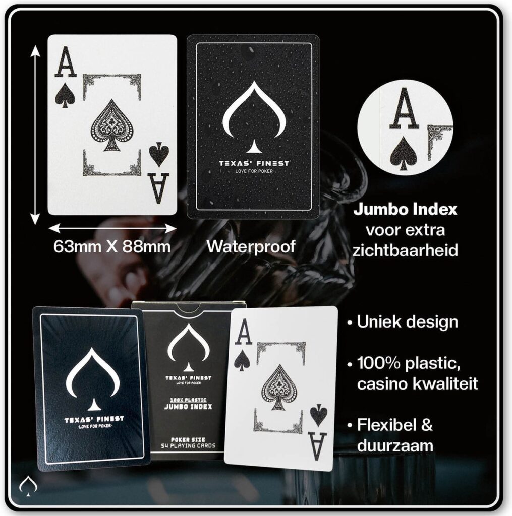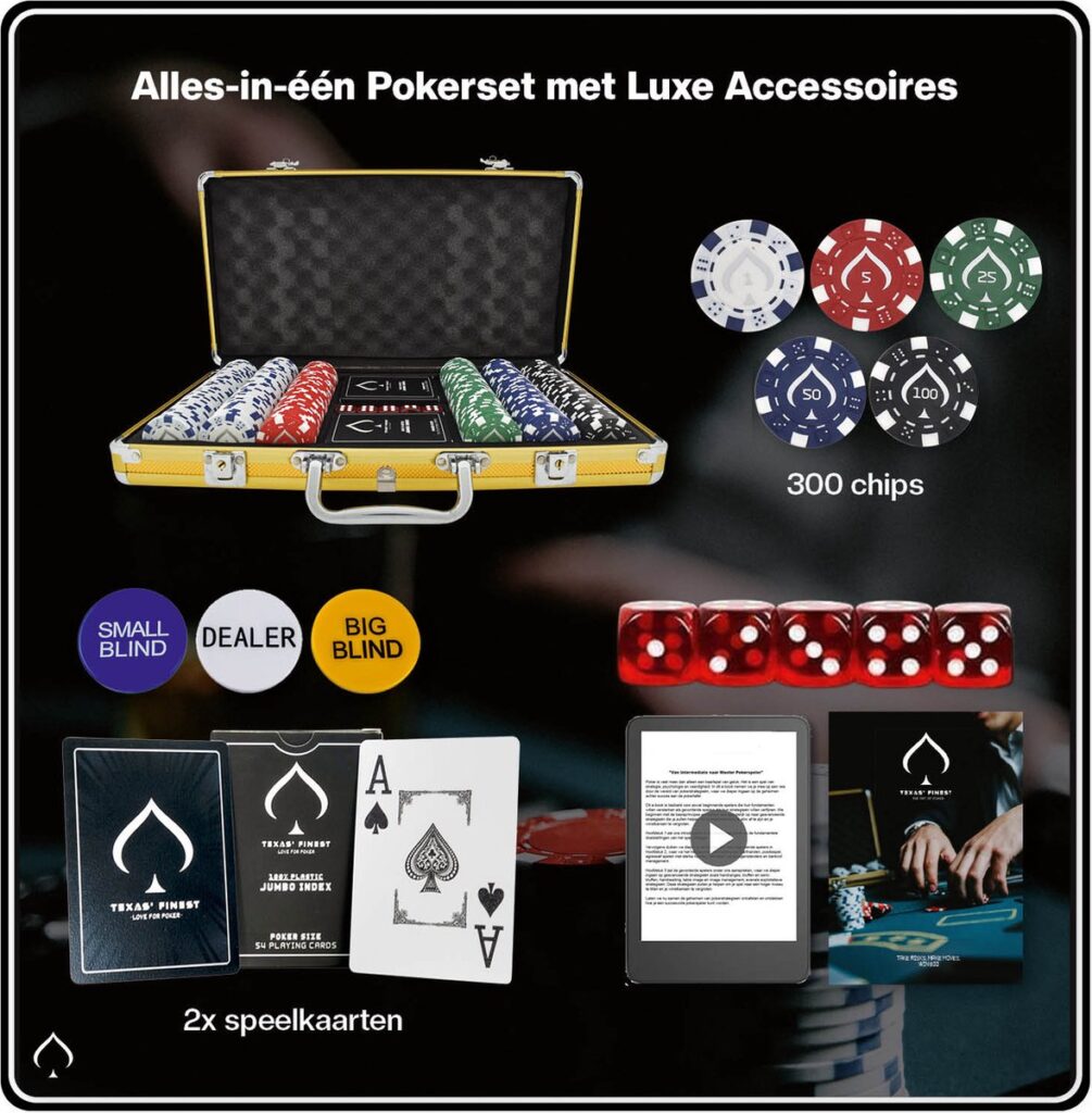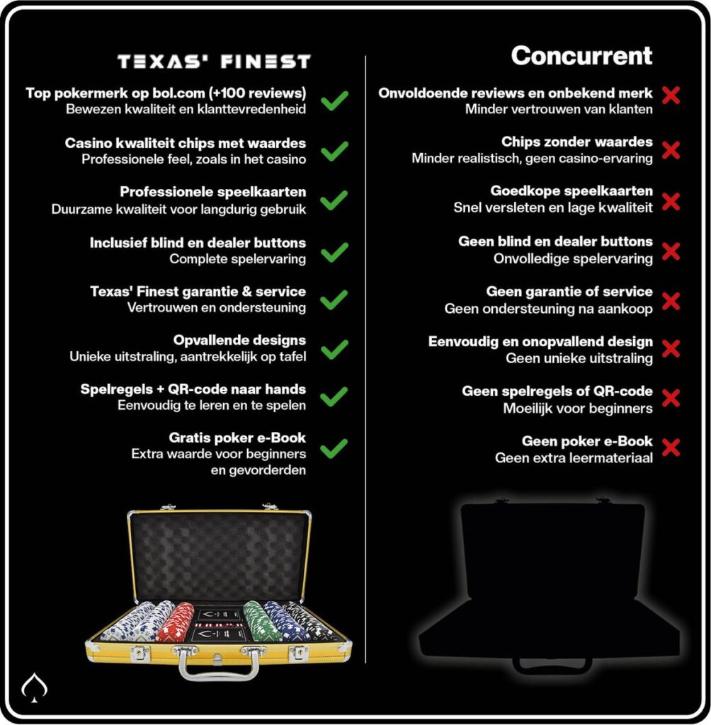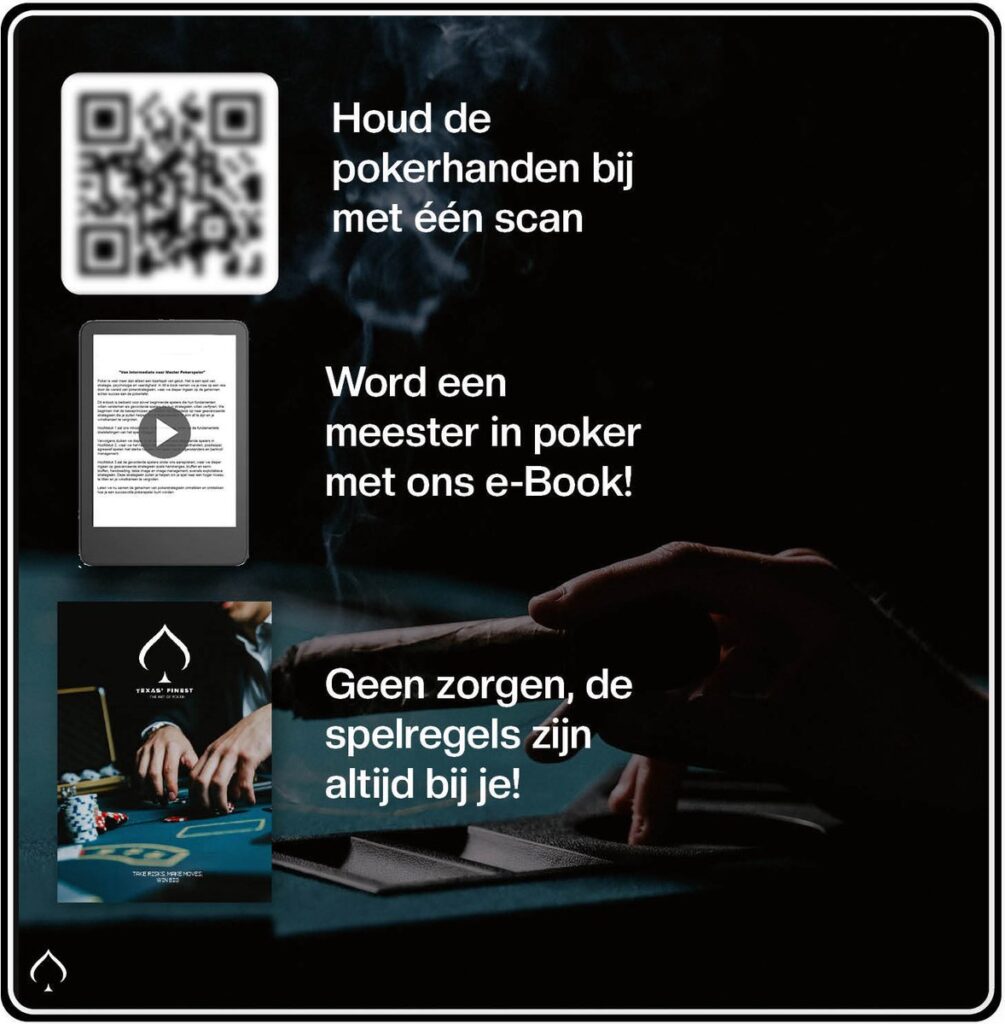 The Texas' Finest poker set, born out of a passion for poker during the coronavirus pandemic. With its luxurious look, custom-made playing cards, and unique chips with value, your poker night will never be the same again. The set also includes a Big Blind, Small Blind, and Dealer button. In addition, you'll never forget the poker hands or poker rules again thanks to the physical and online rules of the game via our handy QR code. As the icing on the cake, we believe it is important that everyone improves their game, which is why we have included a free e-book: "From intermediate to master poker player." We recommend using this set with 2 to 6 players.