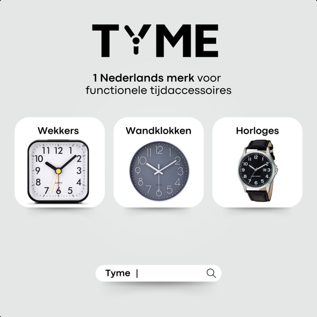Add a touch of elegance to any room with our Tyme Wall Clock. The clock has a diameter of 30cm and stylish Modern design. This Wall Clock is not only a functional accessory, but also a beautiful decoration. Thanks to its whisper-quiet operation and large, easy-to-read numerals, it is the perfect addition to any wall. YOUR BENEFITS: * Stylish design for a sophisticated look * Whisper-quiet operation with no ticking sound * Large digits for easy reading * Anti-reflective glass for clear display * Runs on 1x AA battery for easy maintenance WHISPER-QUIET OPERATION WITH NO TICKING SOUND Enjoy peace and quiet with the Tyme Wall Clock, which operates without irritating ticking noise. The precision movement ensures whisper-quiet operation, allowing you to enjoy your surroundings without distraction. ANTI-REFLECTION GLASS FOR CLEAR VIEWING Our clock's anti-reflection glass ensures a bright and clear display, even in bright light. As a result, you can always read the time without annoying glare or reflections. IMPROVED APPEARANCE The Tyme Wall Clock Modern combines functionality with elegance thanks to its sophisticated design and high-quality workmanship. Whether in your living room, office or bedroom, this clock adds a touch of class to any space. LARGE NUMERALS FOR EASY READING The clock features large, clear numerals that are easy to read even from a distance. This makes it easy to see the time at a glance see, allowing you to better plan and organize your day. RUNS ON 1X AA BATTERY Our clock runs on only 1 AA battery, making it easy to maintenance. You don't have to worry about troublesome wiring or outlets, allowing you to hang it anywhere you want. PACKAGE CONTENTS: * Tyme wall clock Black White (1x) SPECIFICATIONS: * Dimensions: 30x30x4cm * Diameter: 30cm * Color: Black / White * Power: operates on 1x AA battery * Movement: superstill quartz (non ticking)