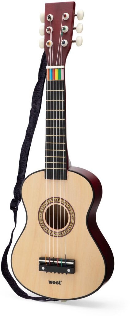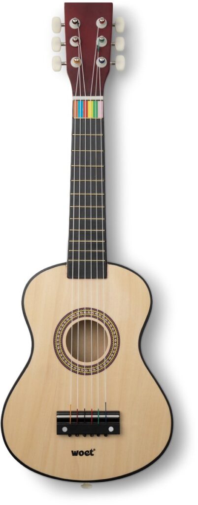 With this classic wooden guitar from Woet®, children can enjoy endless fun making music. A wonderful gift and an inspiring toy instrument that helps young musicians take their first steps in music.