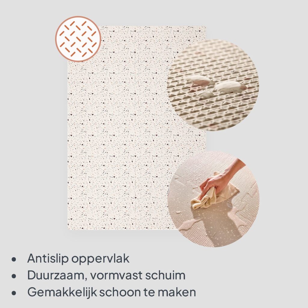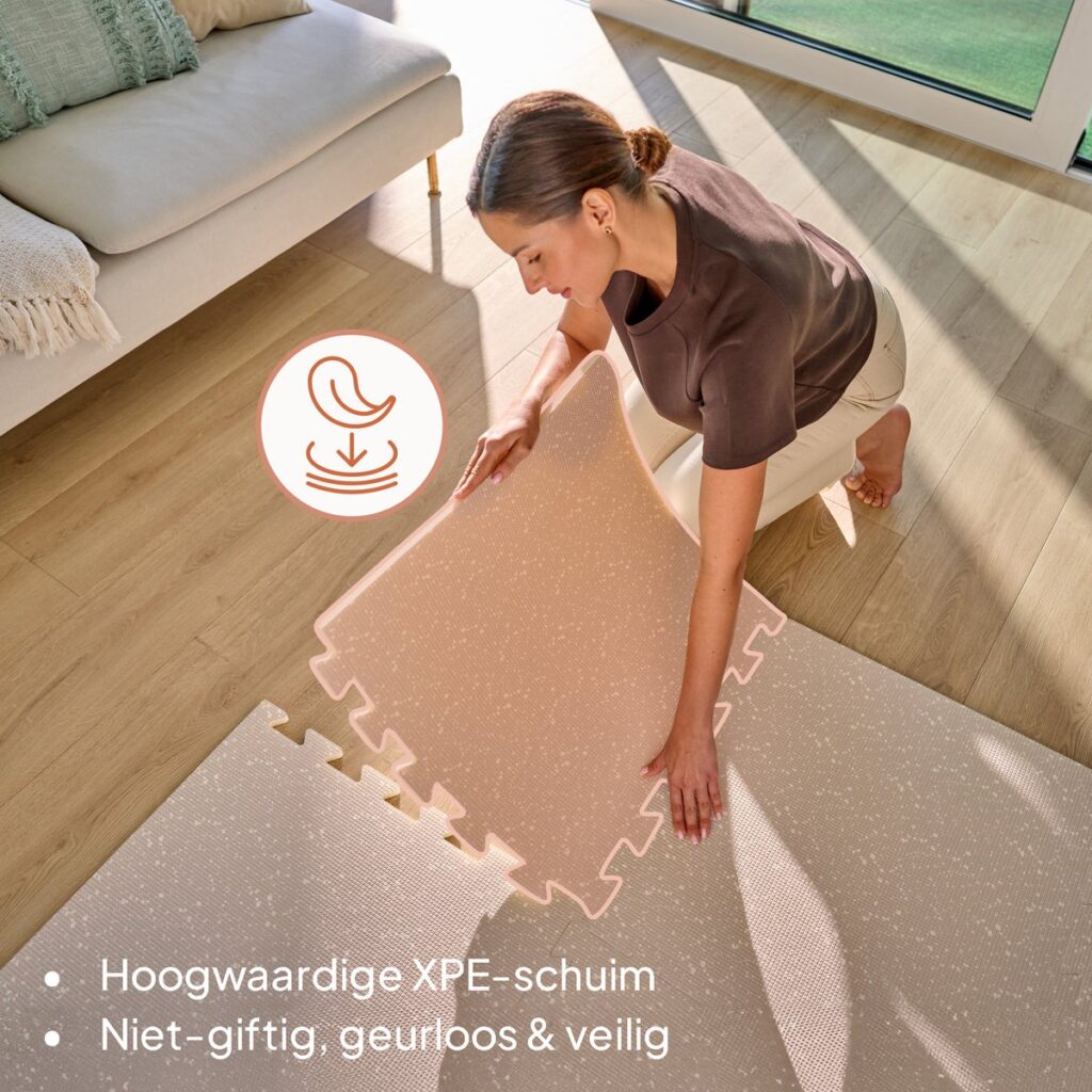 Het antislip oppervlak van de vloerpuzzel geeft extra grip bij de eerste rollende en kruipende bewegingen. De 6 grote tegels vormen samen een stabiele basis voor baby speelgoed 6 maanden en ouder, van rammelaars tot stapelblokken. Afgeronde randen en de 1,5 cm dikke foam-laag bieden extra bescherming tegen harde en koude vloeren, zodat je kind comfortabel kan ontdekken.