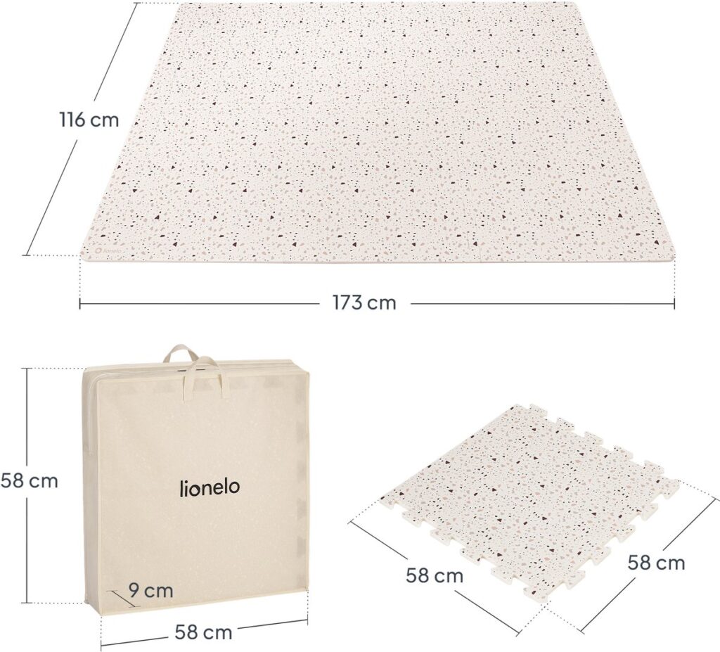 De Lionelo Yoka speelse ondergrond verandert elke vloer in een zachte, veilige speelplek voor de allerkleinsten. De dubbelzijdige mat bestaat uit 6 grote vloerpuzzel-tegels van kwalitatieve foam, met een royaal oppervlak van ca. 173x116x1,5 cm voor rollen, kruipen en spelen. Het neutrale, pastel speelkleed past mooi in de woonkamer, kinderkamer of speelhoek en is ideaal als baby speelgoed 3 maanden, baby speelgoed 6 maanden en speelgoed 1 jaar.