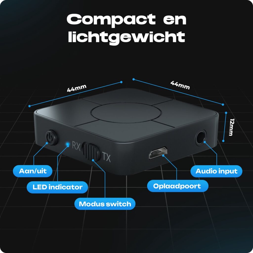 Un appareil compact que vous pouvez emporter partout. L'émetteur/récepteur Bluetooth utilise Bluetooth 5.0. Cette version permet une transmission audio plus stable et plus rapide, tout en consommant moins d'énergie. Il est également facile de distinguer le mode activé en passant de la réception (RX) au flux (TX).