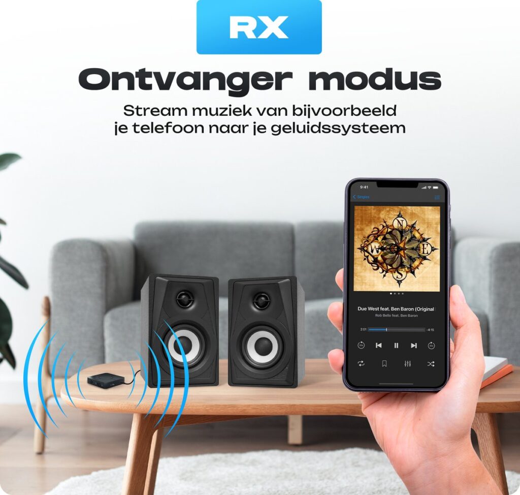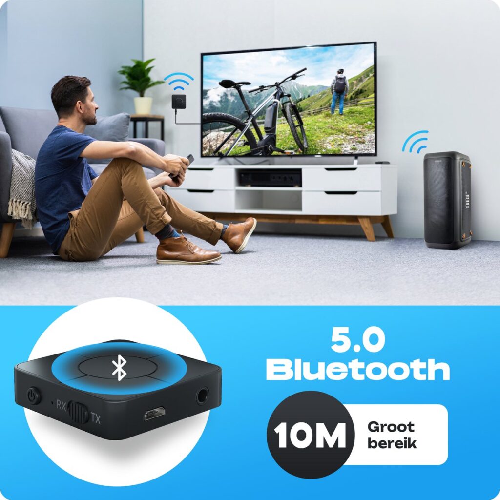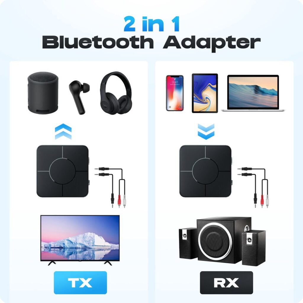 Profitez de la possibilité de convertir tous vos appareils sans Bluetooth avec le récepteur et l'émetteur Bluetooth 2 en 1 5.0 ! La solution sans fil et compacte idéale pour votre télévision, votre système de son surround, votre lecteur CD, vos écouteurs, vos haut-parleurs et bien plus encore !