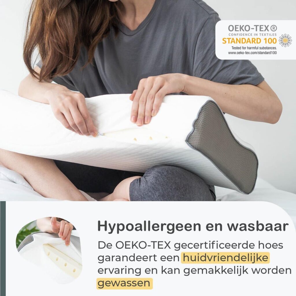 Housse hypoallergénique et certifiée OEKO-TEX La housse hypoallergénique et certifiée OEKO-TEX garantit une expérience douce pour votre peau. La housse est facilement déhoussable et lavable à 50 degrés, ce qui garantit un oreiller toujours frais et propre.