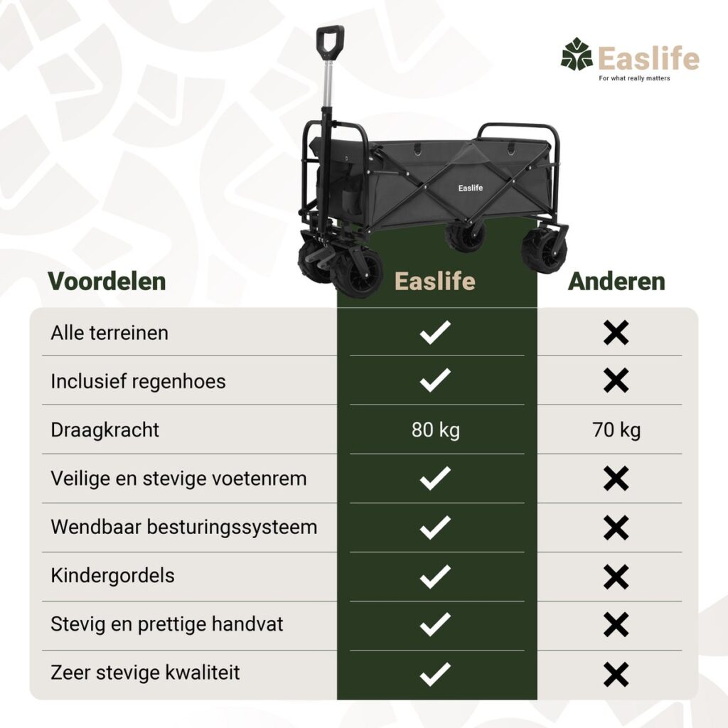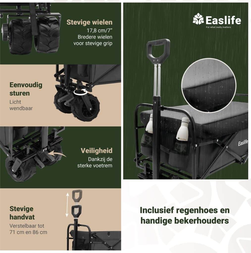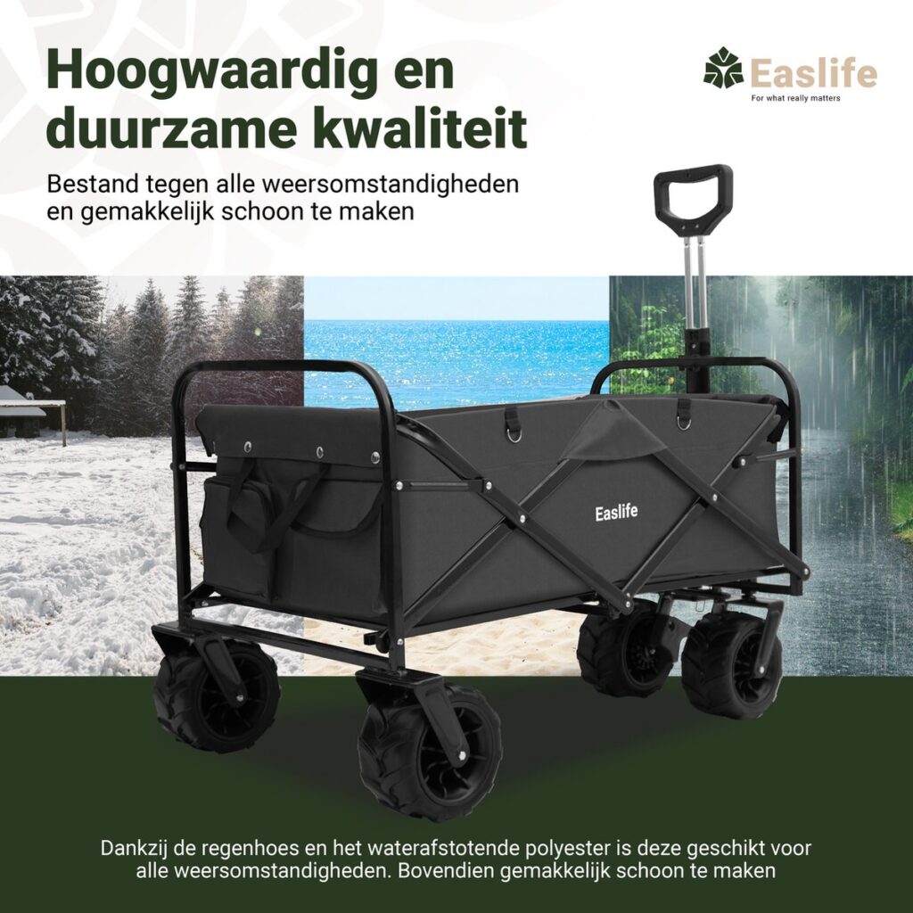 De EasLife Opvouwbare Bolderkar is uitgerust met grote, off-road wielen die garant staan voor uitstekende mobiliteit, zelfs op het meest onvoorspelbare terrein. Strand, bos of stad – deze wielen nemen elke uitdaging aan en zorgen dat je nooit vast komt te zitten.