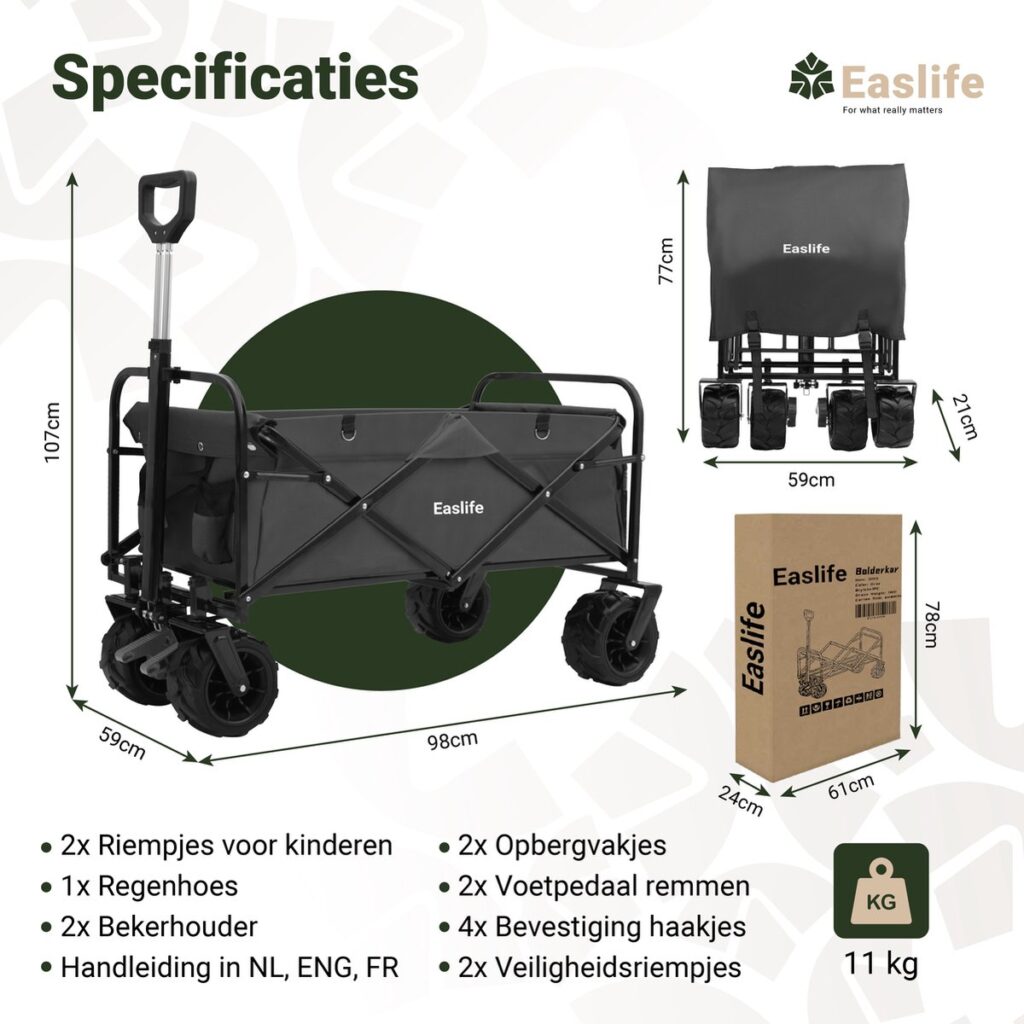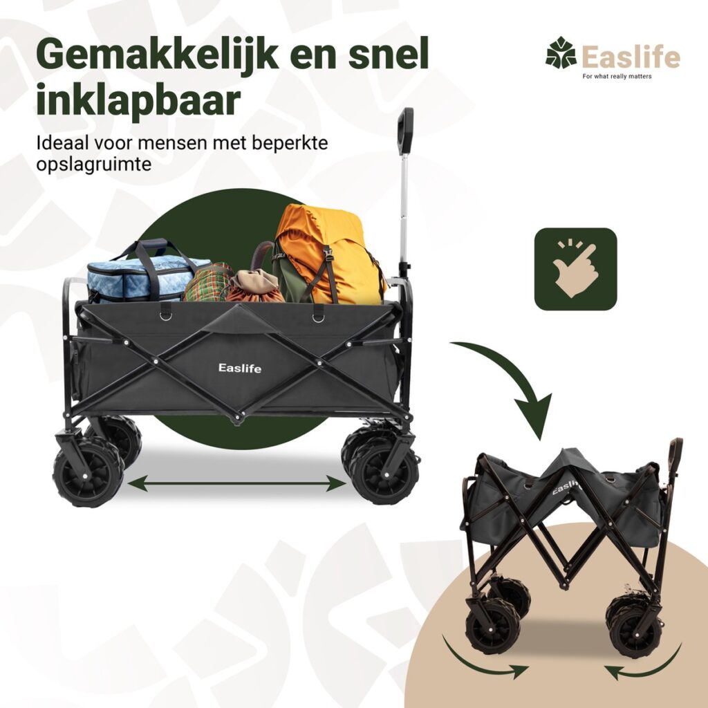 De EasLife Opvouwbare Bolderkar is meer dan een gewone bolderwagen; het is jouw multifunctionele, duurzame en draagbare antwoord op elke buitenactiviteit. Bestel hem vandaag nog en bereid je voor op je volgende avontuur, zonder beperkingen!