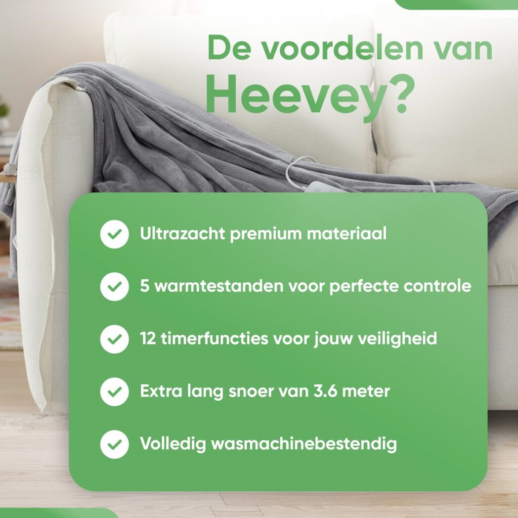 Le froid revient. La solution ultime ? Une couverture chauffante ! La couverture électrique Heevey est conçue pour un confort ultime sur le canapé, dans le lit ou simplement sur une chaise. Soyez toujours à l'aise chez vous avec la couverture chauffante ! Et en plus, elle vous permet de réduire vos frais de chauffage. Que demander de plus ? Découvrez dès maintenant la couverture électrique Heevey !