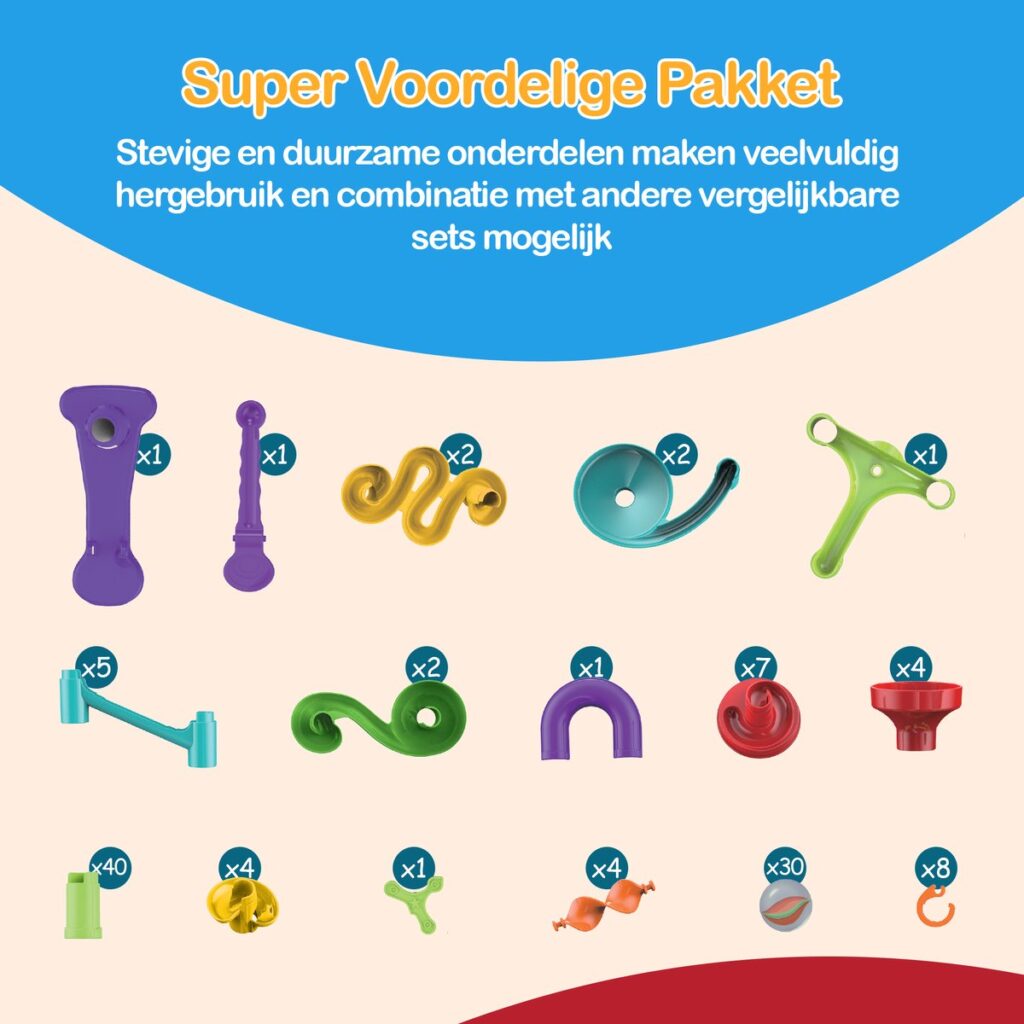 Comprend des courbes, des ponts, des entonnoirs, des toboggans et des piliers verticaux. Tout ce qu'il faut pour construire de hautes tours ou des descentes rapides.