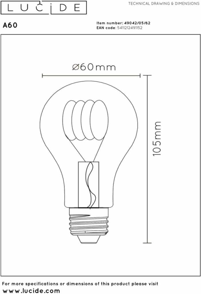 Cet article est une lampe à filament de la marque Lucide. La lampe est de haute qualité et a une longue durée de vie. La lampe à incandescence est équipée d'un raccord E27. La source lumineuse a une puissance de 5 watts et une température de couleur de 2700 kelvins. La lampe produit un rendement lumineux de 380 lumens et possède un label énergétique G. Sa durée de vie est de 15 000 heures.