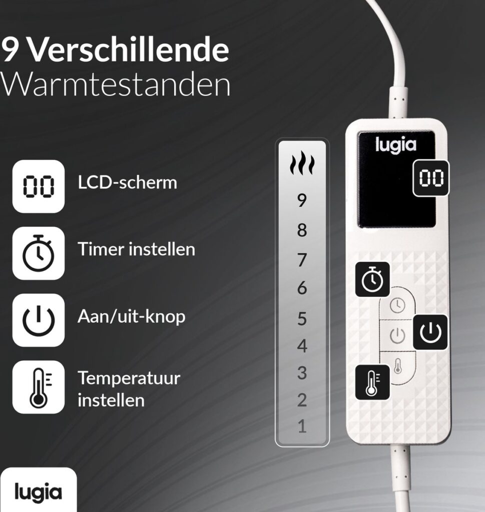 Avec 9 réglages de chaleur différents, la couverture électrique XL de Lugia vous permet de régler la température idéale en fonction de vos préférences. Que vous recherchiez une chaleur légère et douce ou une chaleur intense et profonde, vous pouvez facilement régler la couverture pour obtenir la bonne quantité de chaleur. L'indicateur pratique vous indique clairement le réglage que vous avez sélectionné, pour que vous soyez toujours sûr que la couverture est exactement à la température souhaitée. Vous bénéficiez ainsi d'un confort optimal, quelle que soit la température extérieure.