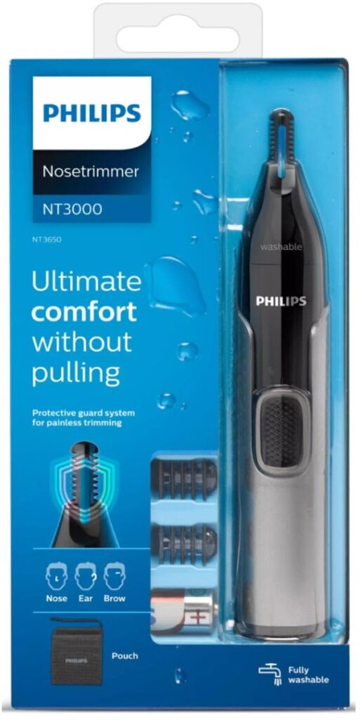 Tondez confortablement les poils de votre nez, de vos oreilles et de vos sourcils avec la tondeuse Philips Series 3000 NT3650/16 - Tondeuse pour le nez. Cette tondeuse pour le nez est dotée d'une nouvelle technologie de protection de la peau qui vous permet de couper les poils sans coupure ni blessure. La tondeuse est également dotée d'un élément de coupe double face, qui vous permet de couper facilement les poils dans les zones difficiles d'accès, quel que soit l'angle ou la direction.