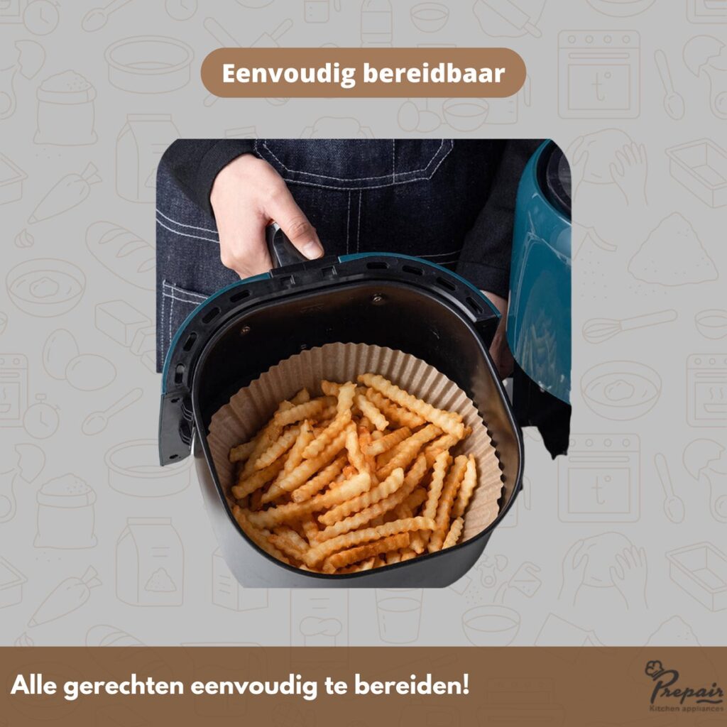 Gebruik hiervoor deze papieren filters van PREPAIR. Gemakkelijk in gebruik, opvangnet voor overbodig vet en geen vuiligheden die achterblijven. Deze filters werp je na het koken in de vuilbak en klaar is kees! Geen gedoe meer om je airfryer steeds uit te wassen of veel plaats in beslag te nemen bij de vaatwasser.