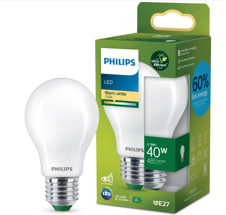Onze meest energiezuinige LED-lamp ooit Gaat tot 50 jaar mee - verlicht je uitgaven, huis en toekomst Deze matte peervormige Philips LED lamp met energielabel A is onze meest energiezuinige lamp ooit. Door 60% minder energieverbruik én een 3,5x langere levensduur dan de gemiddelde LED-lamp bespaar je nóg meer kosten op je energierekening. Omdat deze lamp tot 50 jaar meegaat verspil je ook minder materiaal waardoor je eenvoudig bijdraagt aan een beter klimaat; met LED kan het! Kies voor een duurzame oplossing Gemiddelde levensduur 50.000 uur Met een levensduur van 50.000 uur heb je minder gedoe, omdat de lampen minder vaak hoeven te worden vervangen, en geniet je tot 50 jaar van een ideale verlichtingsoplossing. Ultra efficiënt Beter voor het milieu en je portemonnee Een nieuwe technologie om de CO2-uitstoot en materiaalverspilling te verminderen en het energieverbruik te verlagen. Eyecomfort Licht dat fijn is voor je ogen Harde verlichting is vermoeiend voor je ogen, te fel licht verblindt en te zacht licht flikkert. Je kunt nu jouw omgeving aangenaam verlichten met LED's die comfortabel zijn voor je ogen en de perfecte sfeer in huis creëren.