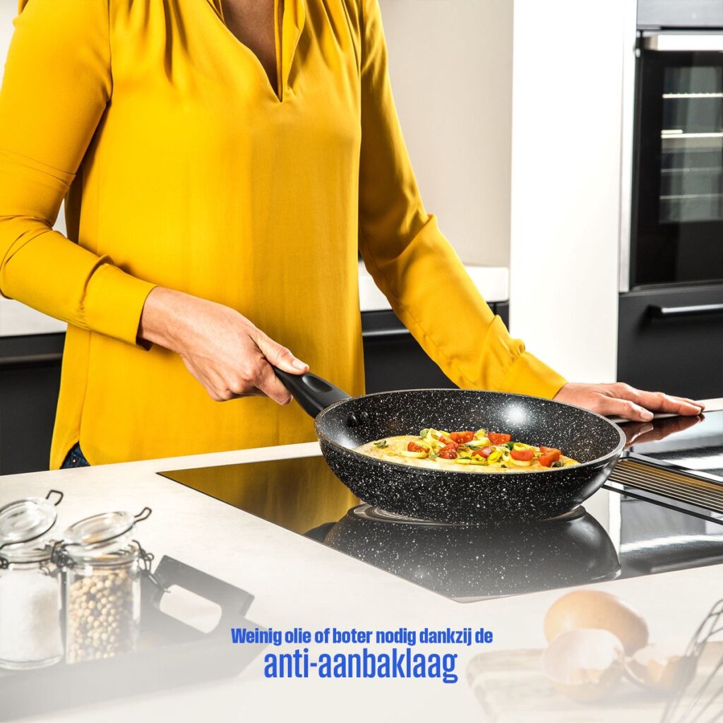 Met de Westinghouse Zwart Marmer Koekenpan (24cm) haal je een mooie basis pan in huis. De uiterst sterke anti-aanbaklaag maakt dat je stukje vis of gebakken groentjes niet vastplakken, zelfs met weinig vetstof. De pan is gemaakt uit aluminium wat zorgt voor een snelle opwarming en gelijkmatige warmteverdeling. Zo bak je de aardappeltjes altijd mooi egaal bruin. Door de innovatieve anti-aanbaklaag van Westinghouse heb je minder olie of vet nodig dan bij traditionele pannen. De anti-aanbaklaag is van uiterst hoge kwaliteit en 100% gegarandeerd vrij van PFOA of andere schadelijke stoffen. Zelfs bij hoge baktemperaturen komen er geen schadelijke dampen vrij en kan je gegarandeerd veilig en gezond koken. De Westinghouse pannen zijn heel eenvoudig te reinigen en gemakkelijk afwasbaar. Door de duurzame anti-aanbaklaag blijven er na het koken geen aanbakresten achter in de pan en volstaat het de pan schoon te maken met een vochtige doek of licht sopje. Bovendien zijn de Westinghouse pannen vaatwasser-bestendig. PLUSPUNTEN: Weinig olie of boter nodig dankzij de duurzame anti-aanbaklaag. Geschikt voor inductie en alle andere warmtebronnen (oven tot 160 graden). Cool-touch ergonomische handgreep. 100% vrij van PFOA en andere schadelijke stoffen. Eenvoudig te reinigen & geschikt voor vaatwasser. AFMETINGEN: - Diameter bovenzijde: 24cm - Diameter onderzijde: 18.8cm - Hoogte: 5cm - Lengte handvat: 19cm Onderhouds- en gebruikstips van de Westinghouse expert: Tip 1 Westinghouse pannen zijn vaatwasser-bestending, toch raden wij aan met de hand af te wassen voor optimaal behoud van de anti-aanbaklaag. Tip 2 Een anti-aanbaklaag moet met enige zorg behandeld worden om er lang plezier van te hebben. Dat betekent bij voorkeur geen krassende voorwerpen als messen, metalen spatels of schuursponsjes gebruiken. Tip 3 Als na verloop van tijd toch een aanslag ontstaat is die te verwijderen door wat zuur te gebruiken. Gewoon een beetje azijn in de pan koken en je pan knapt snel weer op. Tip 4 Voorkom dat de pan aan te grote temperatuurwisselingen blootgesteld wordt. Dus haal de pan niet van het vuur om hem gelijk onder de koude kraan te zetten. Dit voorkomt spanningen in de pan en daarmee kleine beschadigingen. Over Westinghouse Vanaf nu ook verkrijgbaar in Nederland! Een mooie en robuuste met steen afgewerkte collectie pannen die speciaal ontworpen is voor inductie en evengoed werkt op andere fornuizen. In 2021 breiden we onze collectie uit en lanceren we ook de elektrische keuken apparatuur waar Westinghouse om bekend staat. George Westinghouse Jr. was een Amerikaanse ondernemer en ingenieur in Pennsylvania, die de spoorluchtrem uitvond en een pionier van de elektrische industrie was, die op 19-jarige leeftijd zijn eerste patent verkreeg. Westinghouse zag het potentieel in wisselstroom als een elektriciteitsdistributiesysteem in de vroege jaren 1880 en zette al zijn middelen in voor de ontwikkeling en marketing ervan, een beweging die zijn bedrijf in directe concurrentie bracht met het Edison-gelijkstroomsysteem. Na deze concurrentie strijd te hebben gewonnen groeide Westinghouse tot een van de grootste producenten van geavanceerde consumenten producten in de VS, met oa keuken apparatuur, stofzuigers, ventilatoren, pannen en camera’s.