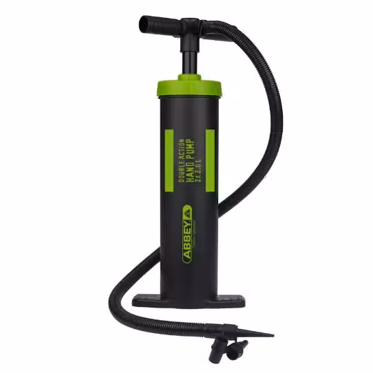 Met deze Double Action handpomp van Abbey Camp heb je je matras of opblaasdier in een handomdraai opgepompt. Klaar om vakantie te vieren! Deze pomp heeft een efficiënte dubbele werking – het pompt op zowel de opwaartse als op de neerwaartse slag. Dat is 4 liter per cyclus dus je bent supersnel klaar. De verschillende mondstukken maken de pomp geschikt voor diverse soorten artikelen. Luchtvolume 2 x 2 liter (opgaande slag en neergaande slag), lengte slang 100 cm, diameter slang 20 mm, pompdruk 0.3 bar.