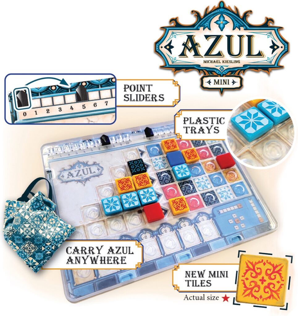 In Azul Mini versieren spelers de muren van een koninklijk paleis door tegels tactisch te kiezen en patronen te vormen. Elke ronde kies je tegels van fabrieksschijven of het midden van de tafel en plaats je ze op je patroonlijnen. Complete lijnen mag je naar je muur verplaatsen om punten te scoren. Tegels die je niet kwijt kunt, leveren minpunten op. Het spel eindigt wanneer een speler een horizontale lijn van 5 tegels op zijn muur maakt. Extra punten krijg je voor complete lijnen en kleuren. De speler met de meeste punten wint!
