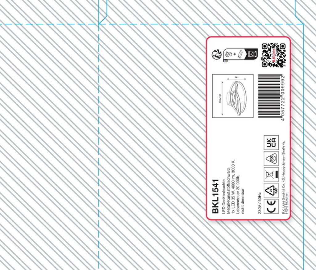 Tot de leveringsomvang behoren een moderne LED-plafondlamp en het bijbehorende montagemateriaal incl. montagehandleiding. De armatuur is niet dimbaar en niet zwenkbaar.