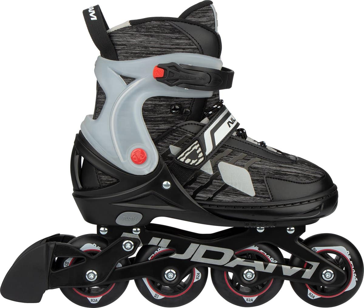 Zoek je fijne verstelbare skeelers voor volwassenen? Met de Nijdam Tarmac Tremor inline skates kun je urenlang rond skaten, trucjes leren of lekker met je hond(en) op pad. Het semi-softboot model bied je comfort en goede ondersteuning en ze zien er ook nog eens lekker sportief uit. Daarnaast is de skate tot wel 5 maten verstelbaar. Of je nu net begint met skeeleren of al wat verder gevorderd bent, de Tarmac Tremor past bij iedereen! Kenmerken: * PE (kunststof) buitenschalen voor goede ondersteuning en bescherming van enkel, hiel en teen * comfortabele polyester lining met foam vulling voor extra comfort * aluminium chassis, zeer duurzaam en van hoge kwaliteit en TPR (rubber) rem * in 5 maten verstelbaar door middel van drukknop op de hiel * maximale belastbaarheid: 100 kg De Tarmac Tremor is tot wel 5 maten verstelbaar door middel van een drukknop op de hiel. De maat van de skeelers valt normaal. Twijfel je over de maat? Bekijk dan de uitgebreide maattabel die bij de foto’s staat. De buitenschalen en de teenkap zijn gemaakt van stevig en duurzaam kunststof. Dit biedt goede ondersteuning en bescherming voor je hiel en enkel en je tenen. De schoen is gemaakt van comfortabel polyester met extra verstevigde PU leren delen. De skate is voorzien van een handige snelsluiting, klittenbandsluiting en een vetersluiting voor een optimale pasvorm. De lining van de schoen voelt zacht aan en is gemaakt van comfortabel polyester. Ook is er extra foam vulling aangebracht voor extra comfort voor je voeten. Ideaal voor urenlang skateplezier! Nu de wat meer technische specificaties: Het aluminium chassis is van hoge kwaliteit. Het voordeel van een aluminium chassis is dat het lichter is en tegelijkertijd stevig en duurzaam is. De PU gegoten wielen geven je een uitstekende grip op de weg. PU wielen slijten minder snel dan bijvoorbeeld rubberen of kunststof wielen, ze hebben de sterkte van kunststof en de elasticiteit van rubber. De ABEC 7 half-chroom lagers zijn hoogwaardige kwaliteitslagers en o.a. uitermate geschikt voor gebruik buiten. De inlineskates zijn voorzien van een TPR rem. Keep on skatin’! Tip: vergeet de skatebescherming en helm niet om veilig te kunnen skaten! Technische specs: * Verstelbaar in 5 maten middels drukknopmechanisme * Chassis: high-impact aluminium gestanst * Quick-lock snelsluiting met PU lederen powerstrap en veters * Buitenschalen: schokabsorberend PE * Binnenschoen: comfortabel polyester, EVA, parelschuim en zacht lycra inzetstukje * Wielen: PU gegoten 85A, 80 x 24 mm * Lagers: gesloten ABEC 7 half-chrome * Rem: TPR 85A * Inclusief 2 inbussleutels