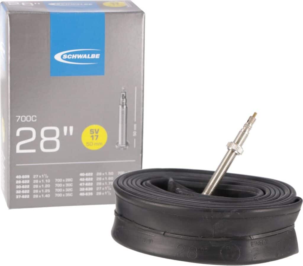 De Schwalbe binnenbanden zijn betrouwbaar, Hoogwaardige en qua gewicht geoptimaliseerde butylrubber. Zo houdt de Schwalbe binnenband de luchtdruk beduidend langer vast dan andere binnenbanden. Het is een groepen-binnenbandsysteem: Een Schwalbe binnenband is extreem elastisch en past op meerdere bandafmetingen. Hierdoor worden ze groepen binnenbanden genoemd. Als laatste is de band 100% volledig recyclebaar. Pluspunten: Speciaal ontworpen in Duitsland 100% recyclebaar Hoogwaardige lekbescherming Gemaakt van extreem lichte materialen Specificaties: - ERTO maat: 28/47-622/635 - Type ventiel: Frans ventiel - Gewicht: 150g - Materiaal: Butylrubber - Merk: Schwalbe - Kleur: Zwart - Lengte ventiel: 50mm - Wielmaat: 28inch Verpakkingsinhoud - 1x Schwalbe Binnenband - SV17 - 28 inch x 1.10 - 1.75 - Frans Ventiel - 50mm