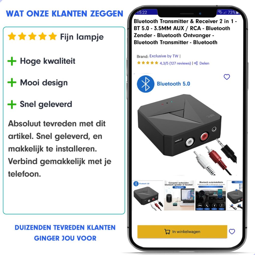 Klik op ‘Toevoegen aan winkelwagen’ en ontvang de 2-in-1 Bluetooth Transmitter & Receiver morgen al thuis!