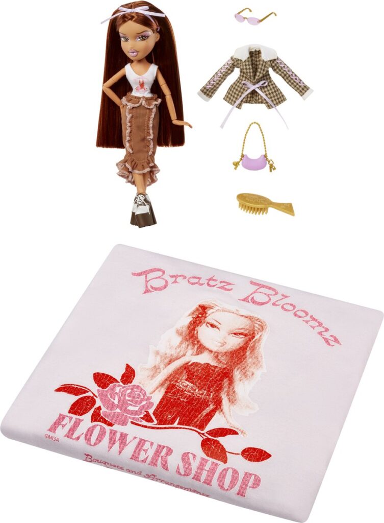 INHOUD: 1 Bratz® Stylin’-pop, 1 tanktop, 1 jas, 1 rok, 1 tasje, 1 zonnebril en 1 haarborstel, plus een T-shirt voor volwassenen in de maat XL dat je zelf kunt aanpassen, zodat het hetzelfde is als het shirt van je pop!