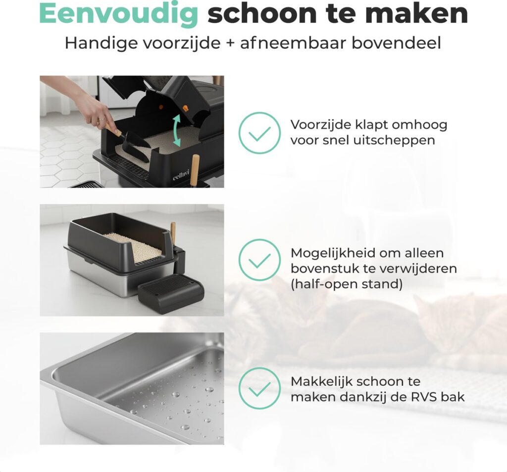 De Cellavi RVS Kattenbak XXXL combineert duurzaamheid met optimaal gebruiksgemak. Dankzij het stevige 3-delige kliksysteem zet je de kattenbak snel in elkaar én maak je hem eenvoudig weer los om te reinigen. De RVS-onderbak voorkomt vastklevende klonten en maakt schoonmaken sneller dan ooit. Het geïntegreerde geurfilter houdt de omgeving fris, terwijl het ruime ontwerp ervoor zorgt dat zelfs grote katten comfortabel kunnen draaien, bewegen en graven. De ideale keuze voor huishoudens die een hygiënische, duurzame en ruime kattenbak zoeken.