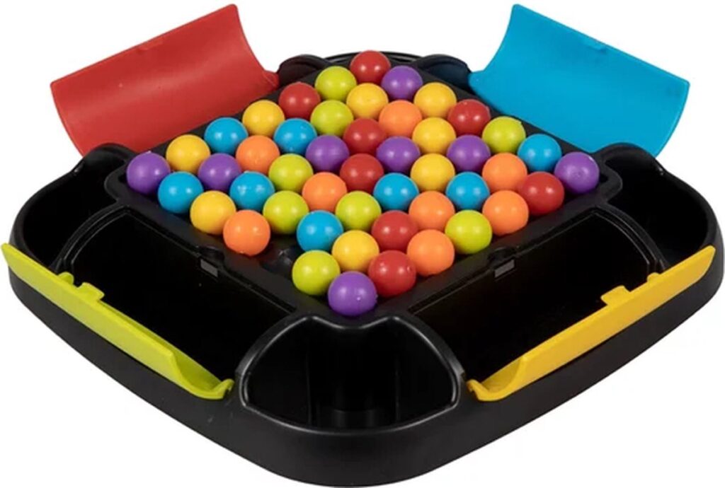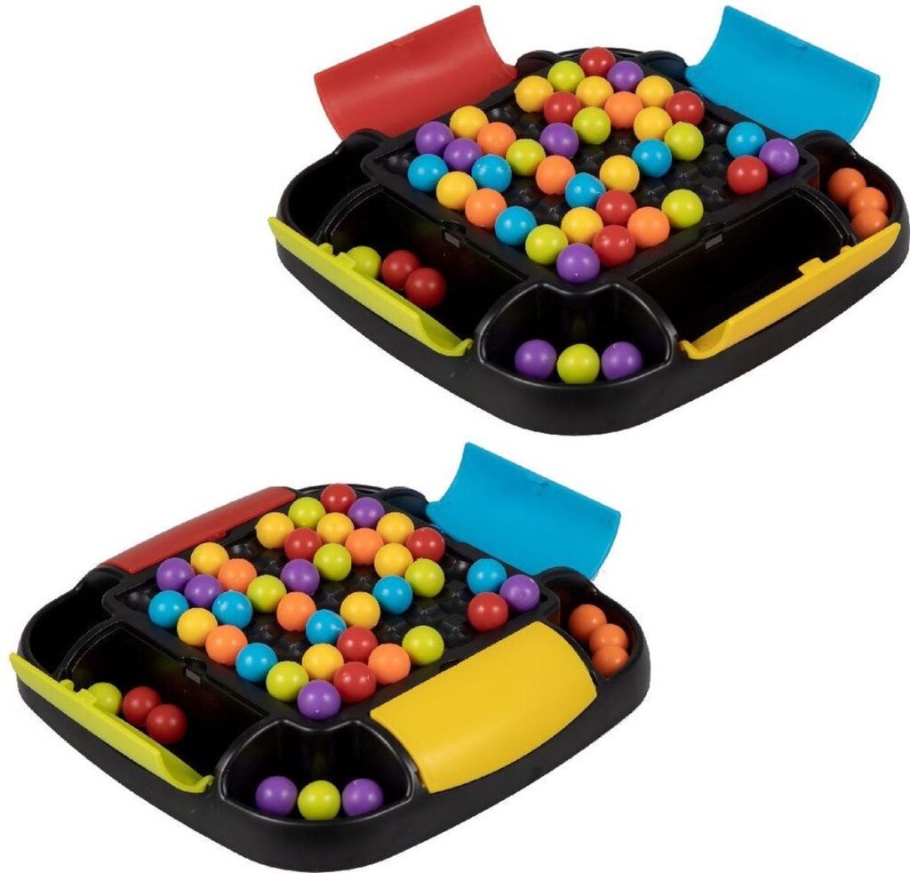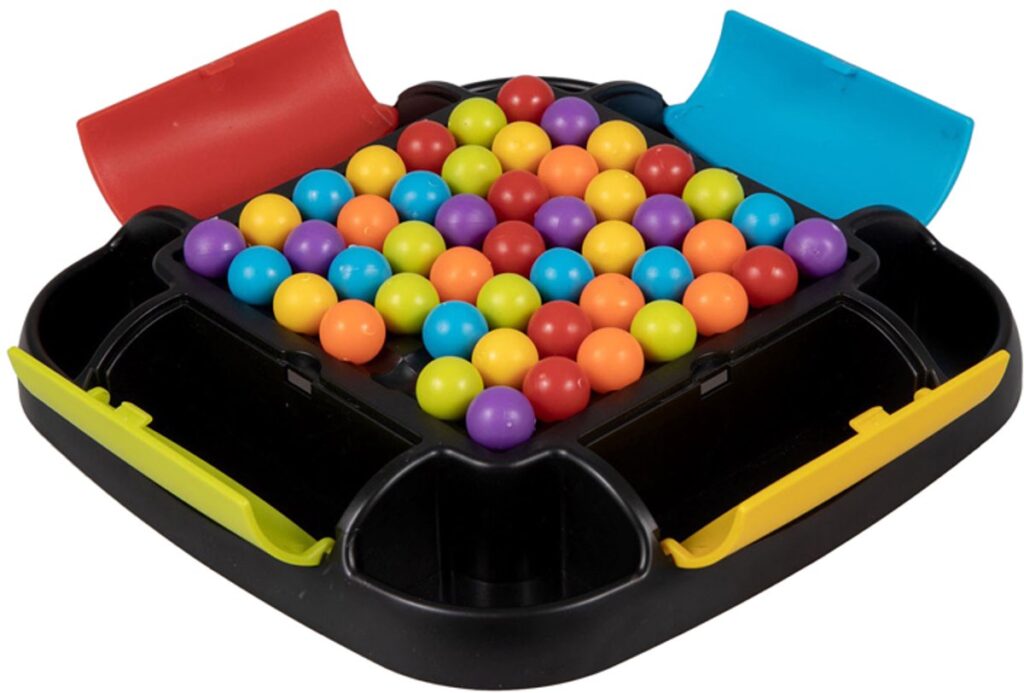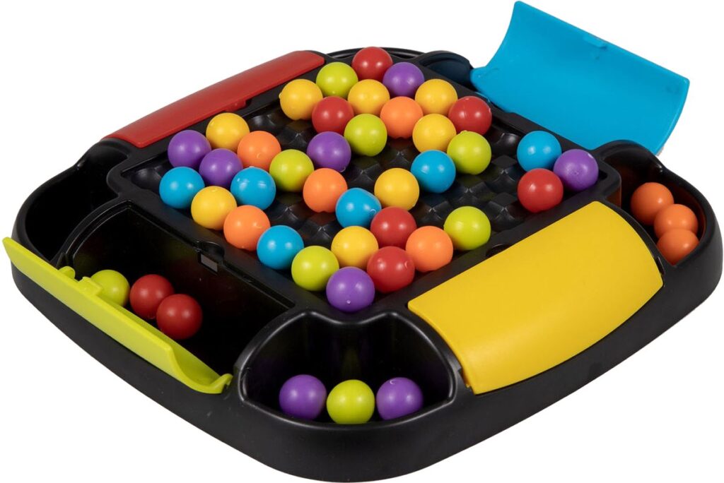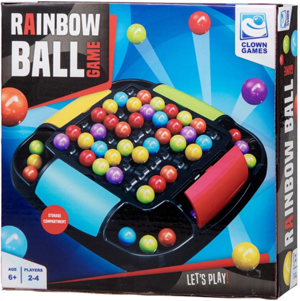 Clown Games Rainbow Ball Game. Bij dit leuke spel plaats je balletjes op een bord. De balletjes hebben alle kleuren van de regenboog. Het doel van het spel is, om een rij met balletjes op een strategische manier te verschuiven, zodat zoveel mogelijk balletjes van dezelfde kleur op elkaar aansluiten. Alle aangrenzende balletjes mogen worden verzameld: wie er de meeste verzamelt, heeft gewonnen! Het bord heeft opbergvakken in 4 kleuren, zodat je na het spelen alle balletjes kunt opruimen. Inhoud: speelbord, 48 regenboogballetjes. Wordt geleverd in full-colour verpakking. Geschikt voor 2 tot 4 spelers vanaf 6 jaar.
