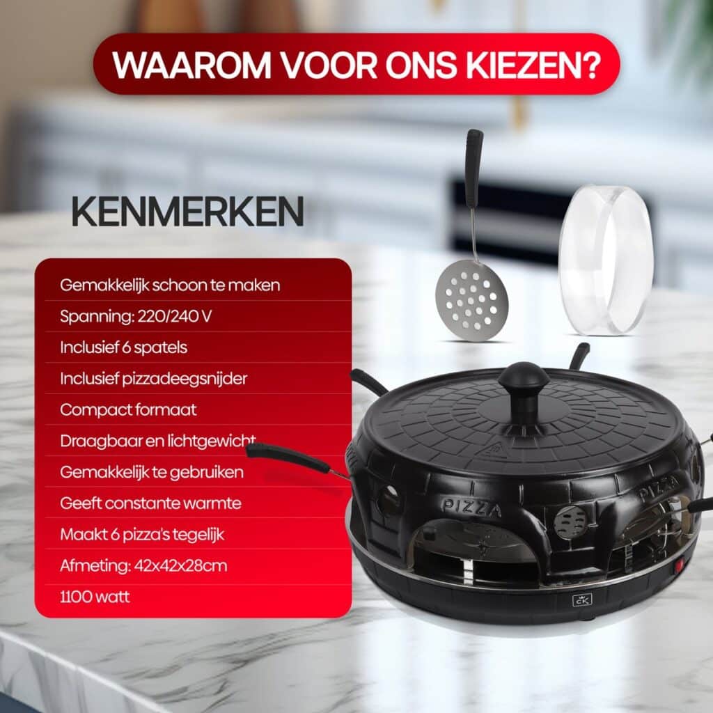 De CuisineKing Mini Pizza Oven is gemaakt van hoogwaardige, hittebestendige materialen en biedt gelijkmatige warmteverdeling voor perfecte resultaten, keer op keer. Dankzij de handige antiaanbaklaag bak je zonder zorgen over vastzittend voedsel. Bovendien zijn de onderdelen eenvoudig schoon te maken, zodat je snel weer klaar bent voor het volgende gebruik.
