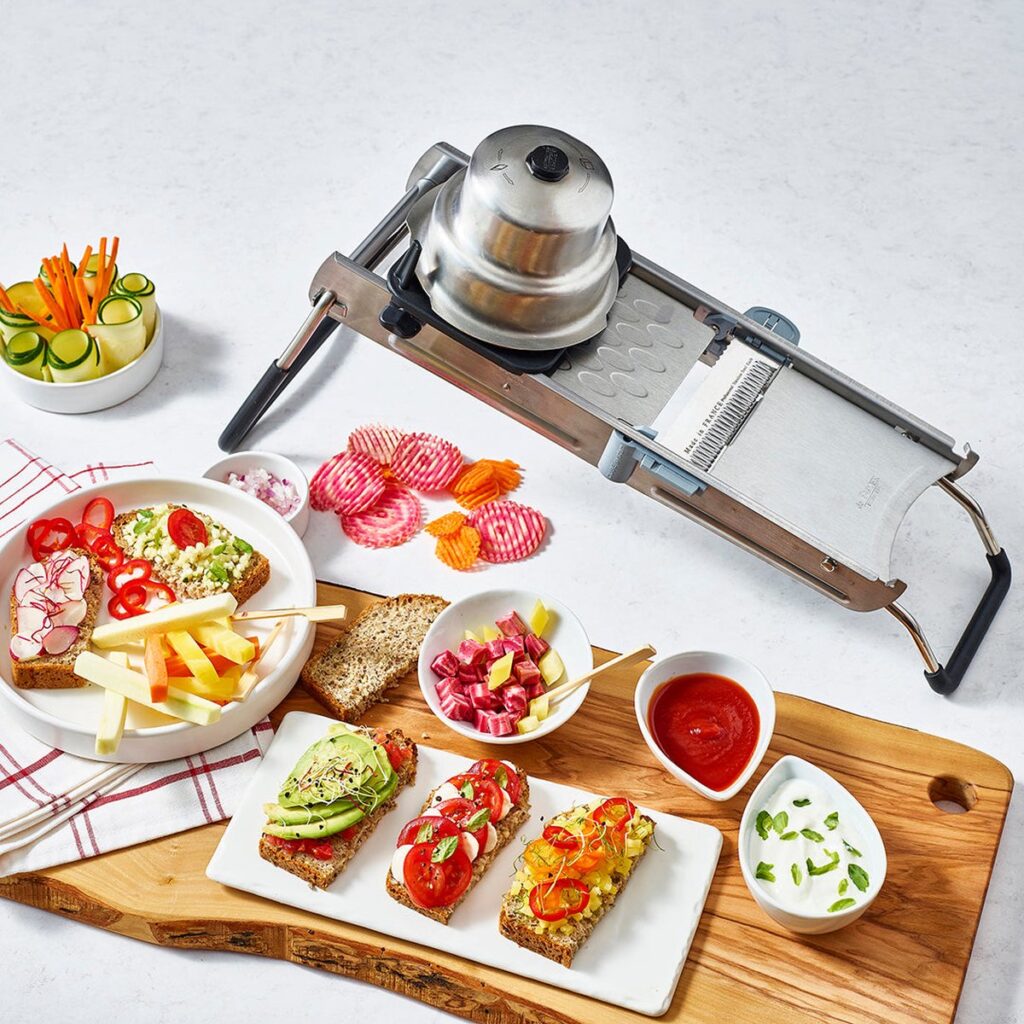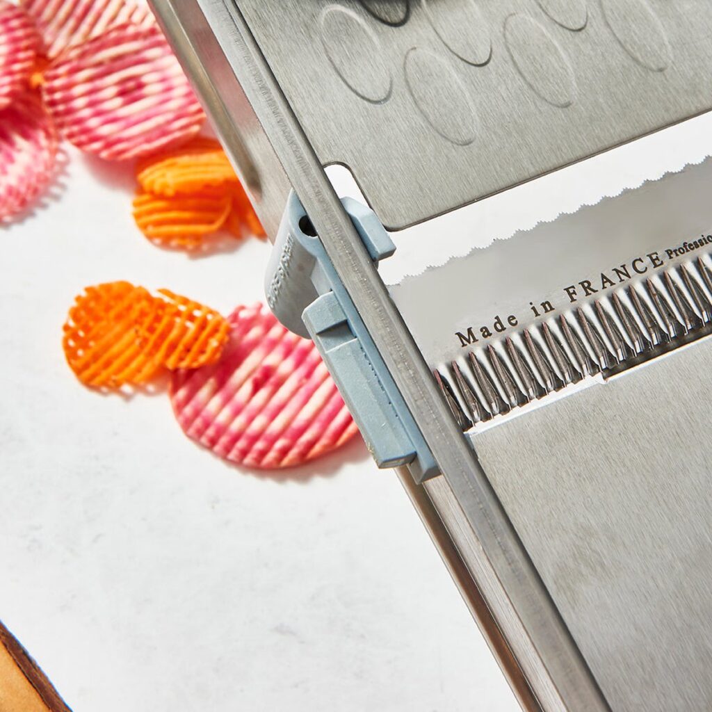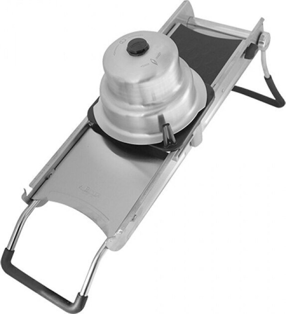 Deze ultra mandoline van De Buyer maakt het snijden van je groenten en fruit zeer gemakkelijk. De mandoline is van professionele, zware kwaliteit. De snijder is gemaakt van geborsteld roestvrij staal en is voorzien van een dubbel horizontaal mes, zowel glad als gekarteld. De dikte is eenvoudig aan te passen, van extra dun tot 10 mm. Tevens zitten er 3 Julienne messen bij van 2, 4 en 10 mm. Zo kun je het groente en fruit in meerdere stijlen snijden. Een ergonomisch ontworpen schuiver maakt het werk aangenamer. De mandoline is erg compact. Onder de snijder zit een houder voor de Julienne mesjes en een opvangbak. De mandoline heeft 2 inklapbare voeten, die voorzien zijn van een anti- slip materiaal.