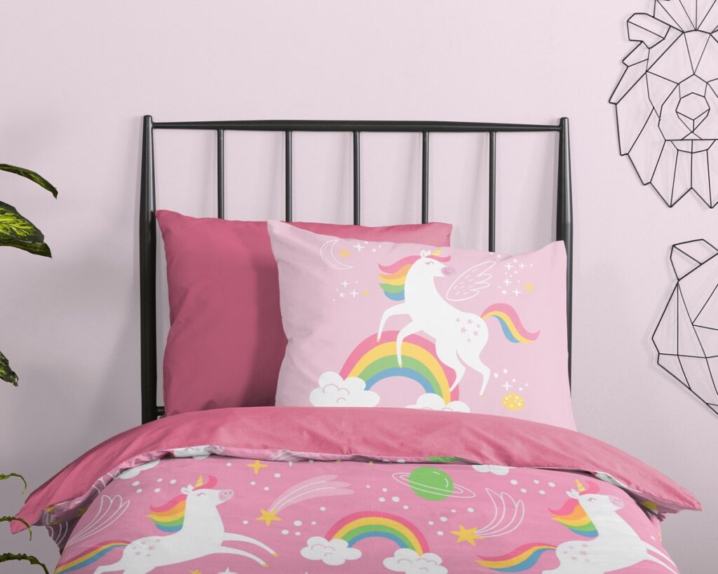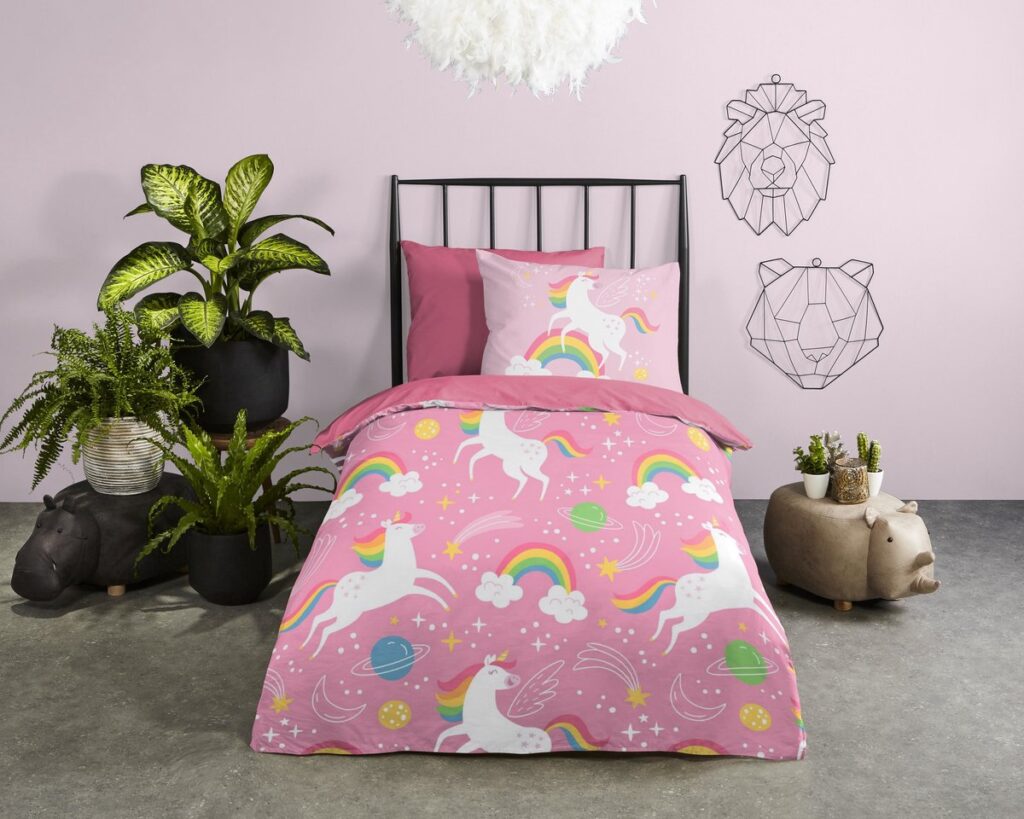 Wasbaar kinderdekbed van Pure met synthetische vulling. Dit roze gekleurde, wasbare dekbed is voorzien van een leuke eenhorns op regenbogen print. Het vormt een gezellige toevoeging aan iedere kinderkamer en is onderhoudsvriendelijk. Een goed dekbed draagt bij aan een comfortabele nachtrust voor je kind.