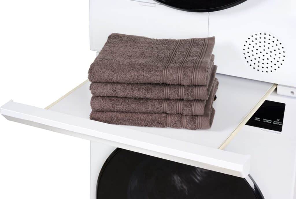 Uitschuifbare plank: De stapelkit wordt geleverd met een uitschuifbare plank, waardoor u extra werkruimte creëert bovenop uw wasautomaat. Deze plank biedt een handige plek uw wasmande.